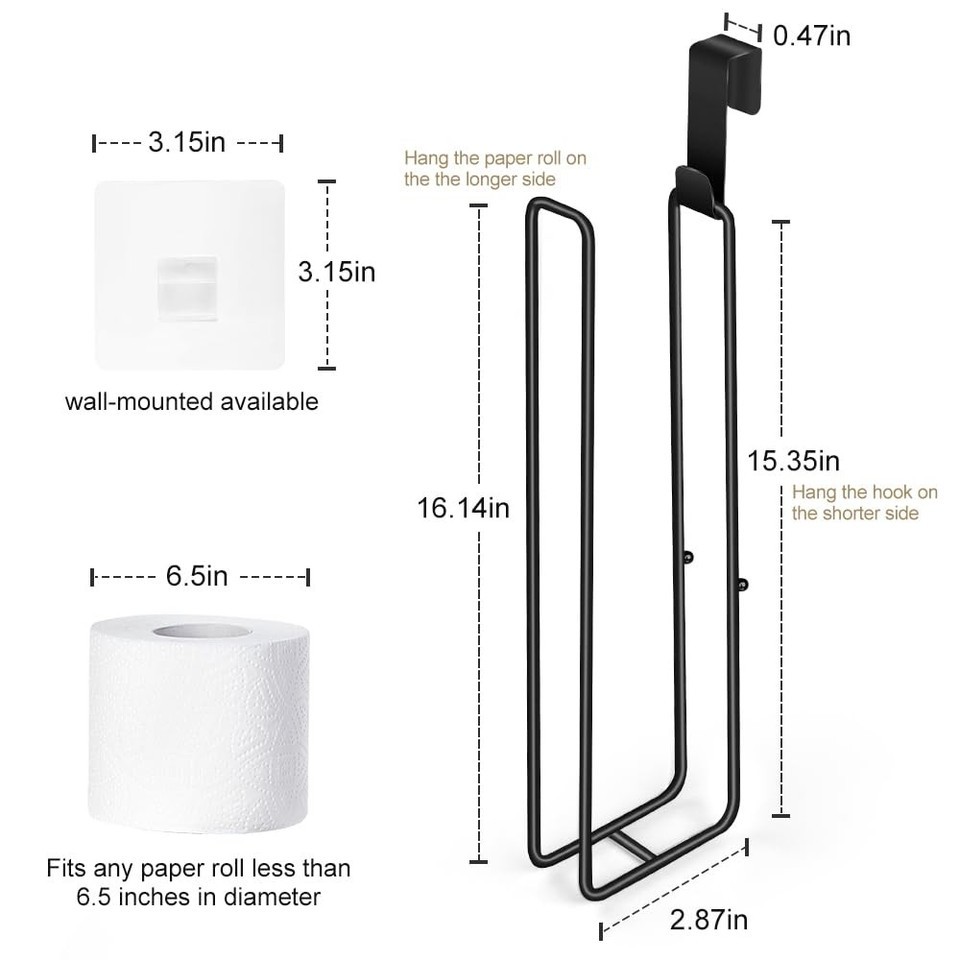 Black Over Tank Toilet Paper Holder - 4 Roll Tissue Storage - Wall Mount Option