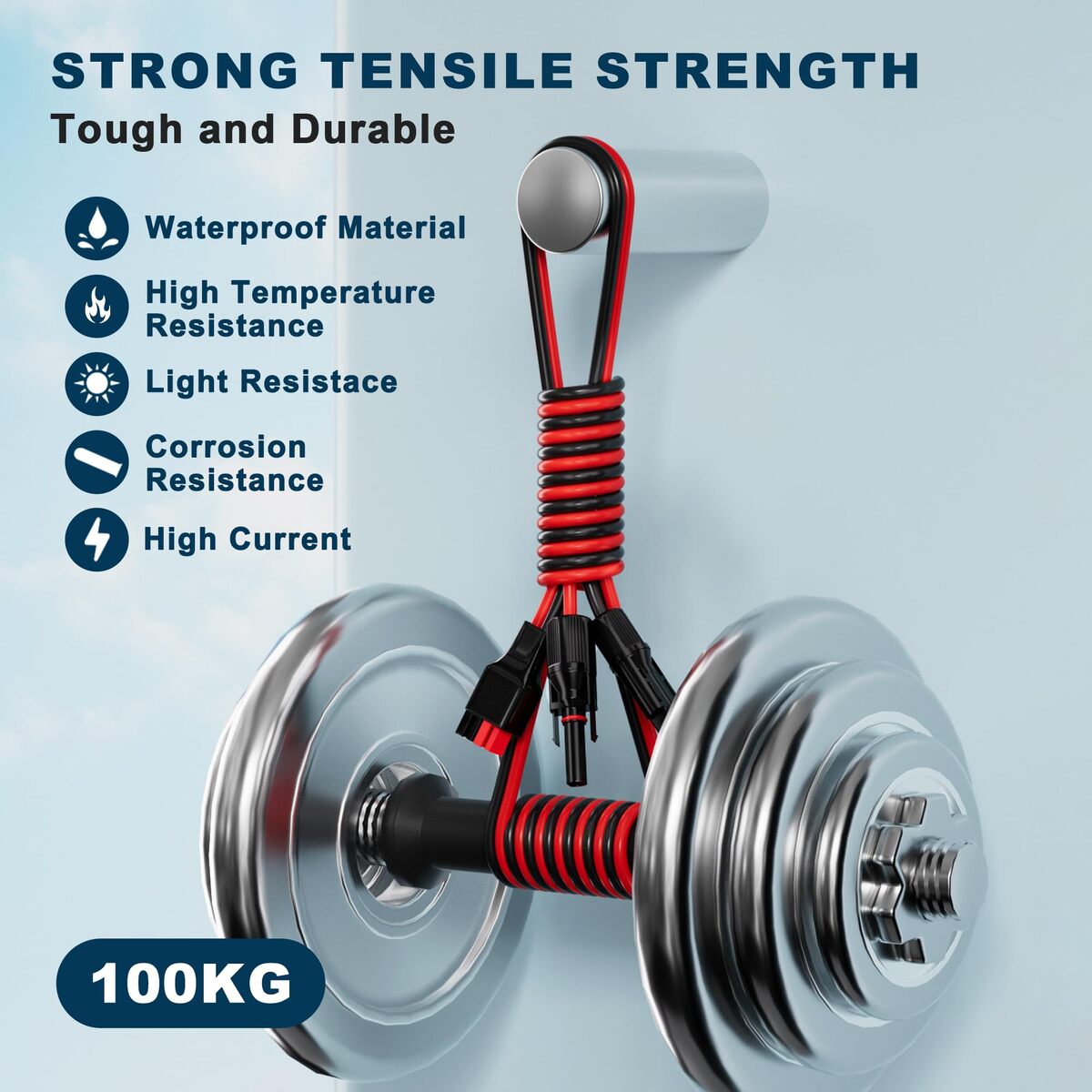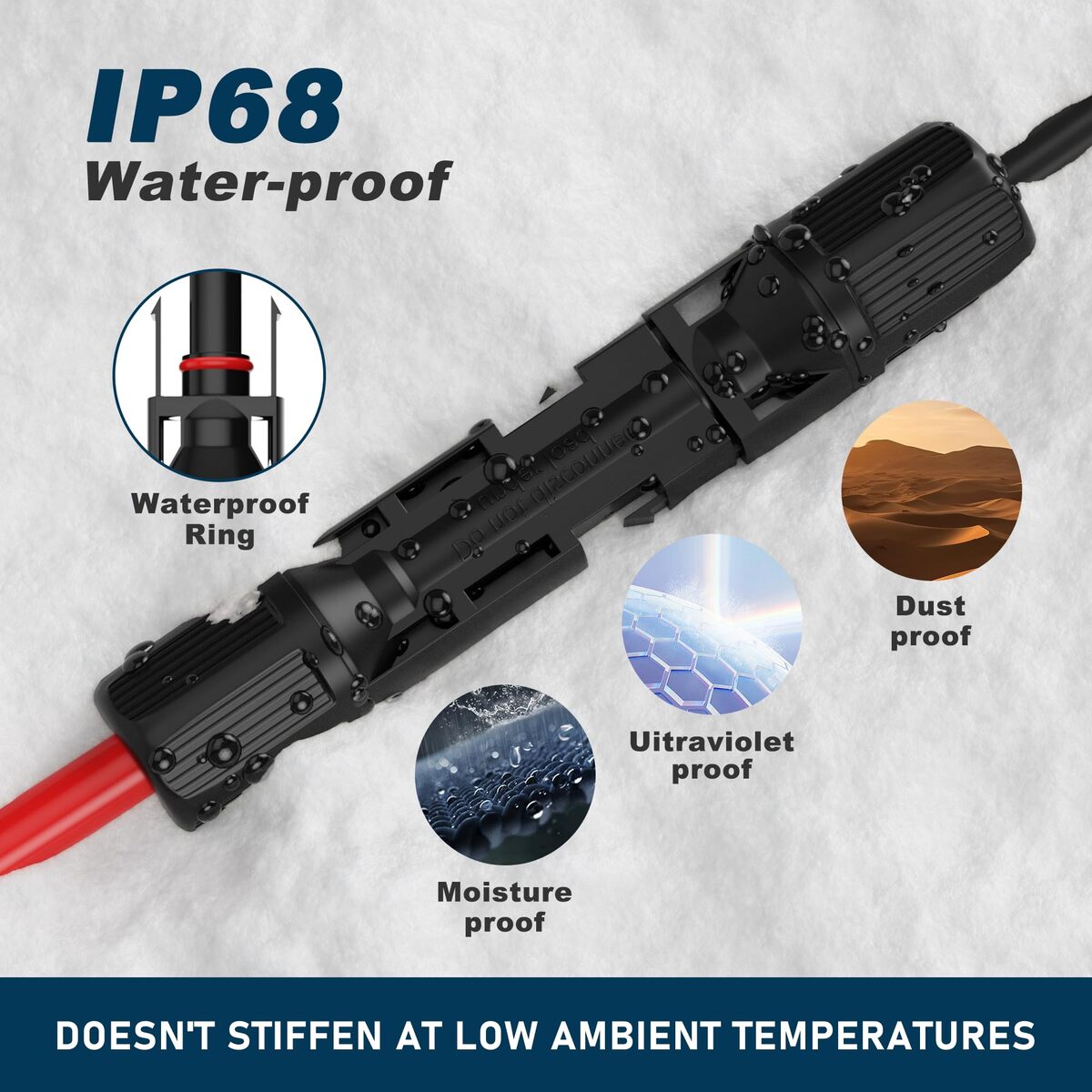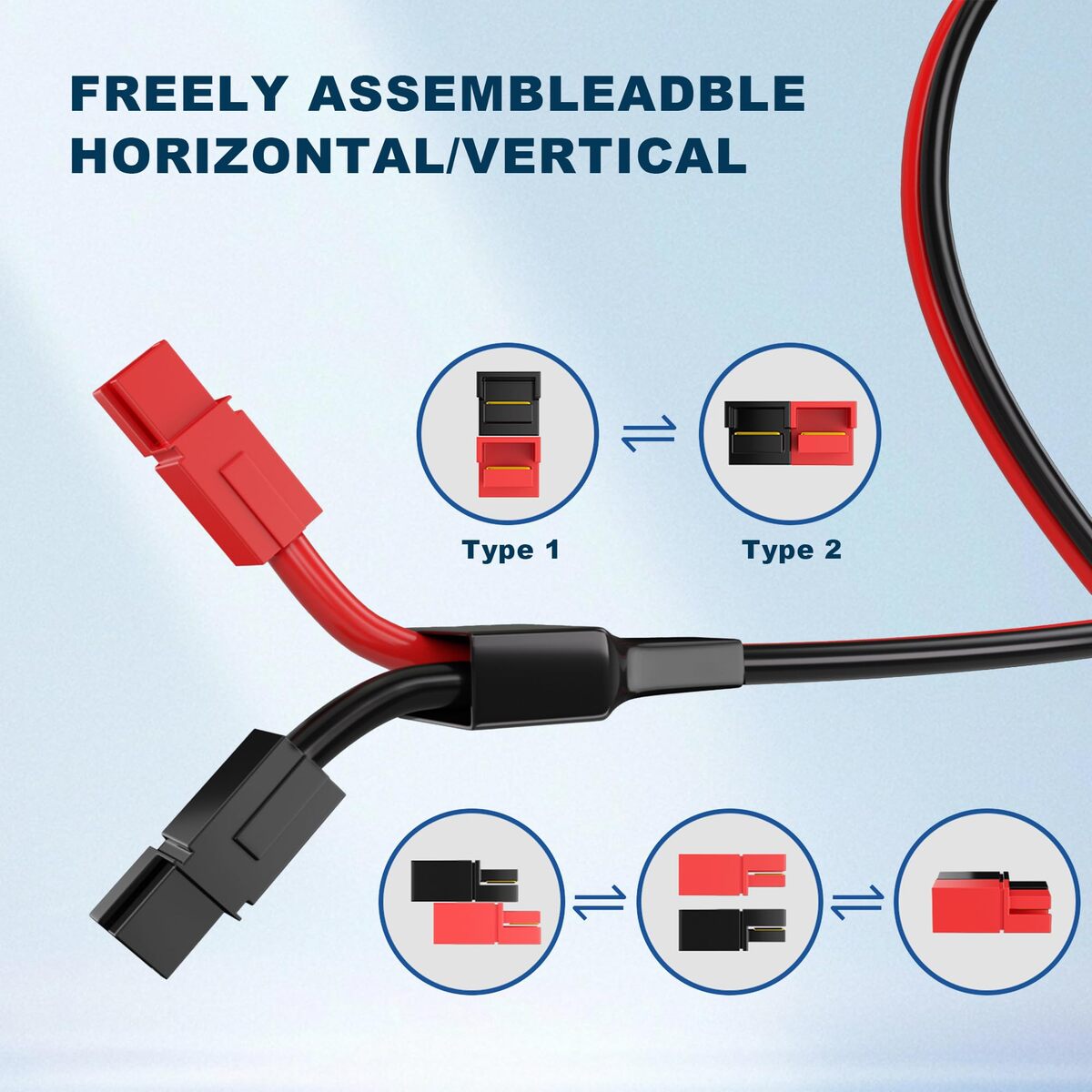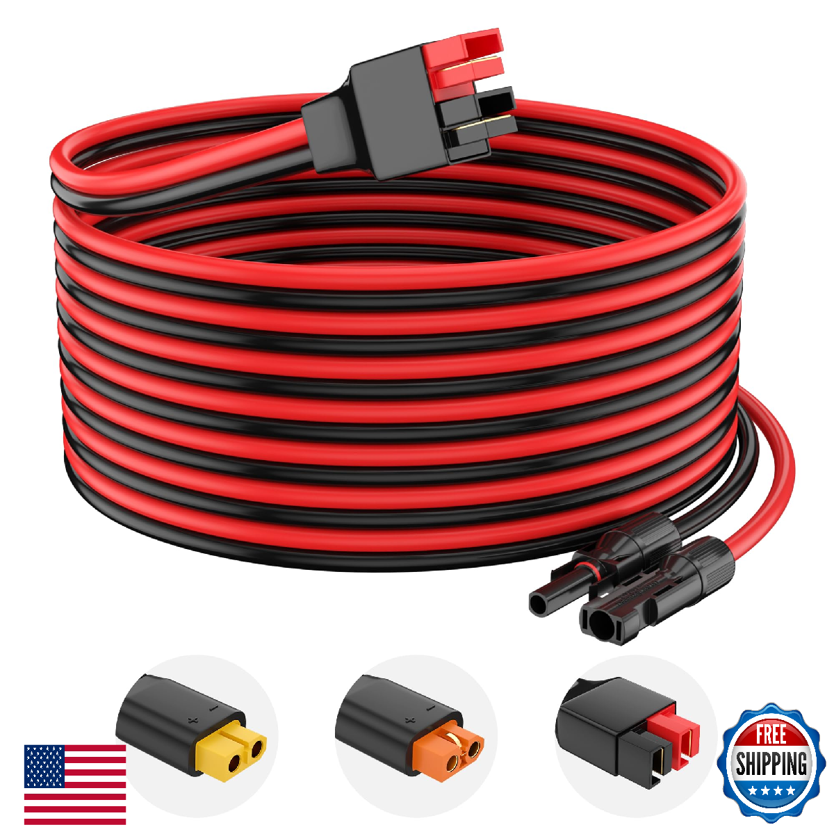 ?10AWG/12AWG solar connector to XT60/XT60i cable?---The solar to XT60/XT60i cable has passed UL1015, CE and TUV certification. One end of the Y type is a solar panel plug (male/female), and the other end is an XT60 connector, free to build an off-grid system. There are has many choice in length (1FT-100FT) for you to choose.,?Upgraded 20000+ Bend XT60/XT60i Connector?---The XT60/XT60i has a new upgrated and reinforced injection molding design, and has passed a 20000+ bend and plug test lifespan , strengthens the fixing and safety of the solar wire, which prolongs the solar xt60/xt60i female cable's service life.,?Waterproof IP68 Protection and TUV Certificaxtion?---Solar connectors have waterproof rings to ensure that male and female connectors can be connected tightly and prevent water or dust from entering the connectors; our solar panel connector(male/female) has passed TUV Certification,?Wide Application?---This solar extension cable is used to connect solar panels and solar generators, suitable for all solar generator power Stations, battery packs, and any with devices XT60/XT60i female port. The solar wire is suitable for ecoflow delta pro, ecoflow river, ecoflow solar panels, and can also work with other brands' power stations and panels,?Anderson Connector?---The Anderson connector can easily be adjusted to switch polarity or change from a horizontal to vertical connector on your device.