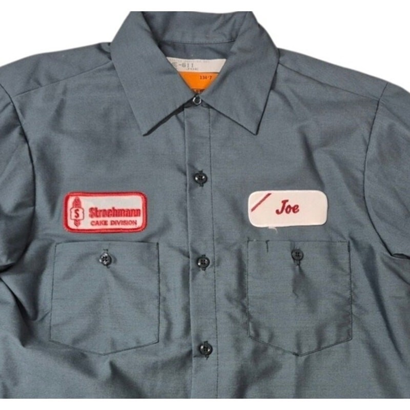 This authentic, cotton-blend long-sleeve work shirt comes in a classic vintage green, characteristic of the era's utilitarian style. What makes this shirt truly special are its original, embroidered patches: one proudly displaying the name "Joe" and the other featuring the iconic logo of the "Stroehmann Cake Division." Stroehmann has a rich history in American baking, known for its breads and cakes, and this patch connects the shirt directly to that legacy.