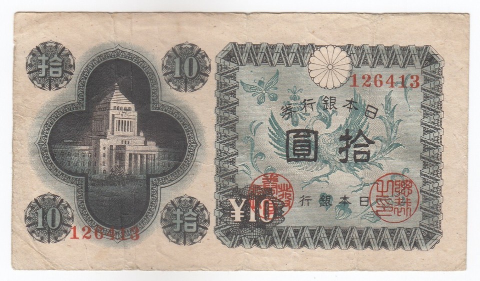 Japan, 10 Yen, 1946, Overprint, Banknote, SN. 126413, Old Issue, VF, Rare
