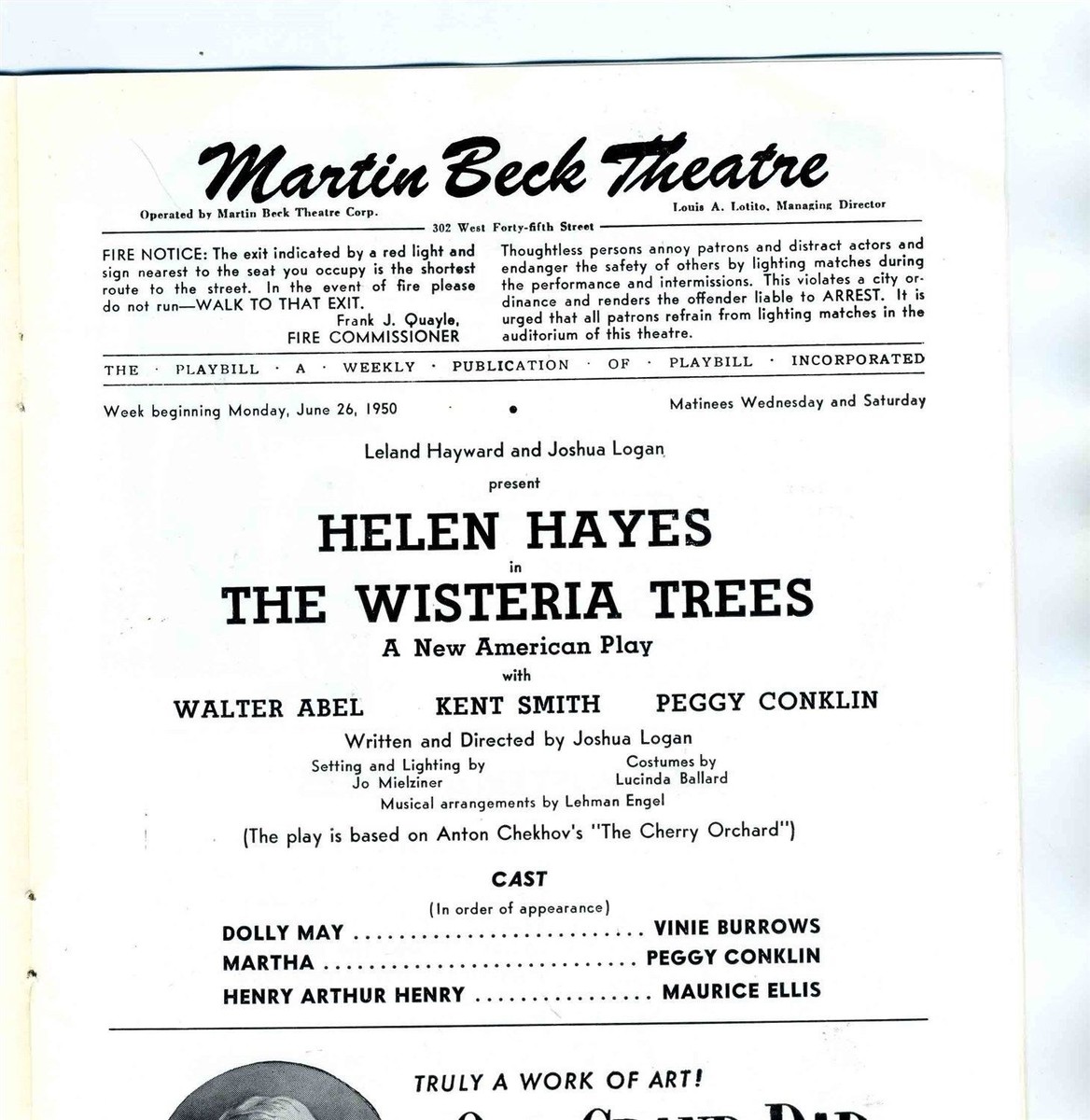 A Playbill for The Wisteria Trees from a performance in 1950 at the Martin Beck Theatre in New York City. In fine condition. Starring Helen Hayes, Walter Abel, Kent Smith, Ossie Davis and others
