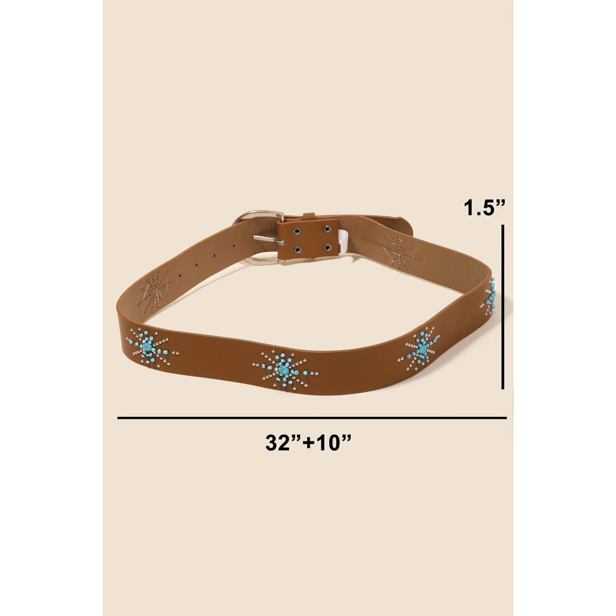 This vegan leather belt brings a touch of Western personality to any outfit without going over the top. The turquoise starburst design is bold enough to turn heads but refined enough to pair with everything from jeans and boots to a flowy sundress. At 42 inches, it's a versatile length that works at the waist or hips.