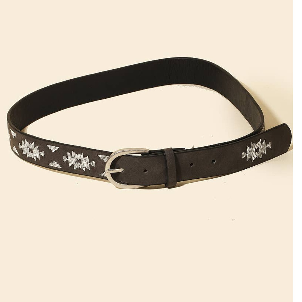 This vegan leather belt is the finishing touch your outfit has been waiting for. The intricate Aztec-inspired embroidered pattern brings a rich, bohemian Western energy to any look ? pair it with denim and boots, a maxi skirt, or your favorite Western wear. At 42 inches, it's a versatile length that works beautifully at the waist or hips.