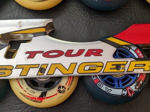 A vendre est un ensemble d'occasion d'avions a rouleaux en ligne Tour Stinger 7000, cadre en aluminium, 5 roues, pales de roulement.