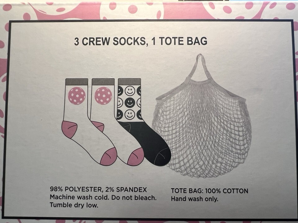 PICKLEBALL 3 PAIRS CREW SOCKS SIZE 9-11 AND 1 TOTE BAG GIFT SET WHITE PINK BLACK