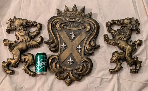 Set of 3 1960s Modern Art Co Lion Coat of Arms Chalkware MCM Wall Art Plaque