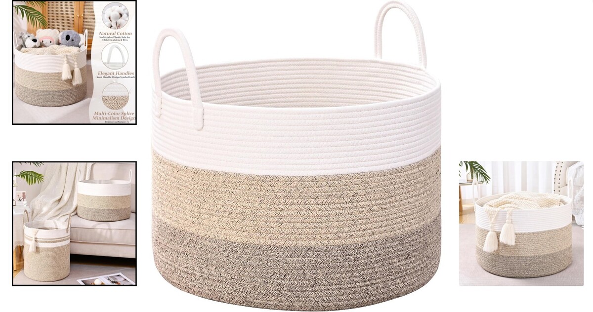 Are you ready to turn the tide on clutter? Our 20"x13" Kid-Approved Toy Basket is designed to bring joy and order into children's environments. Made from safe, natural cotton, it?s gentle for little ones while remaining sturdy for heavy use. Let your children take part in the fun of organization?catalyzing their growth while making cleanup a delightful game. Versatile and lightweight, it's the ideal stylish solution to store toys, essentials, and even your furry friend's supplies. Embrace the charm and practicality that our toy basket promises?order yours today and watch your child's space transform!