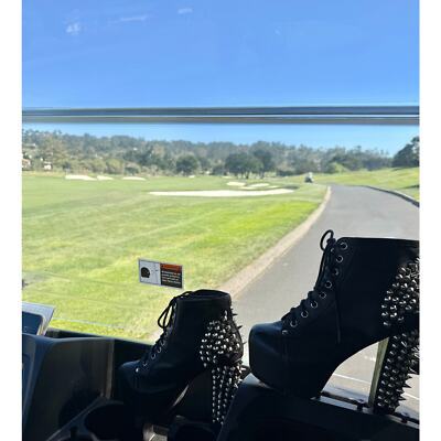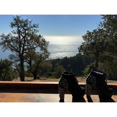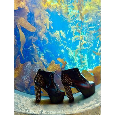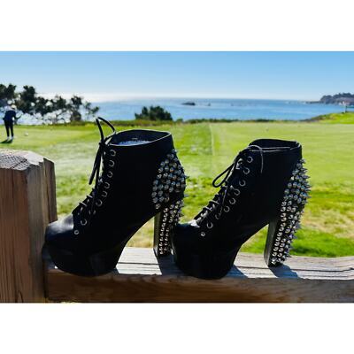 Spike by Jeffery Campbell size US 6.5 women. There are some scuffs on the toes, and one stud is missing on the back of the right Shoe. Other than that, these are in great shape. These retail at $240. These have had a fun journey- purchased in Monterey, CA, they went on a few rides, including Pebble Beach Golf Course, The Monterey Bay Aquarium, Big Sur, and 17 Mile drive, including a great shot with the "Lone Cyprus".