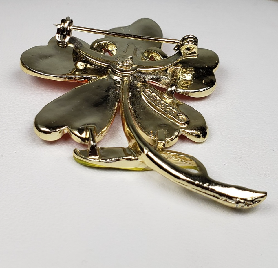 Vintage Signed GERRYS Enamel Flower Leaf Orange Yellow Green Gold Tone 2" Brooch