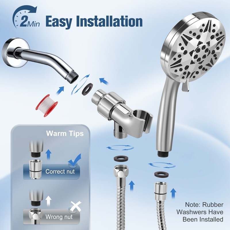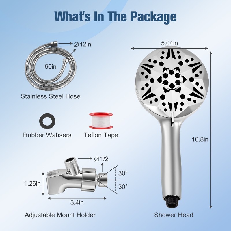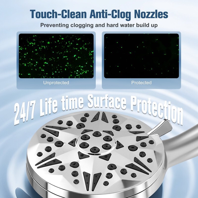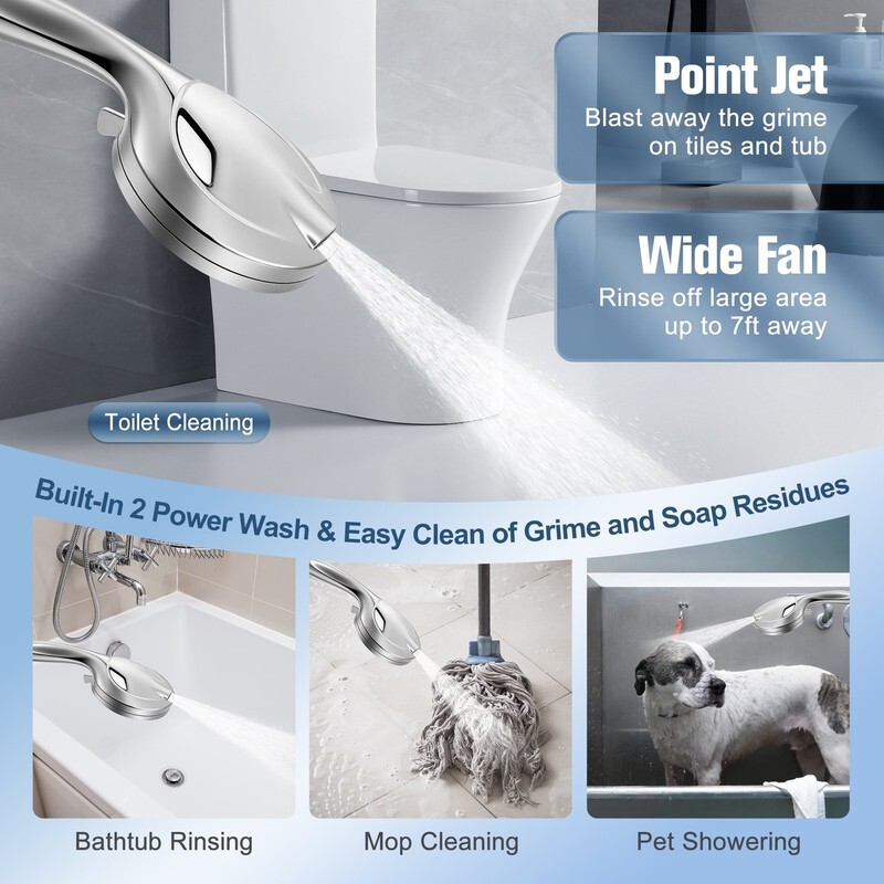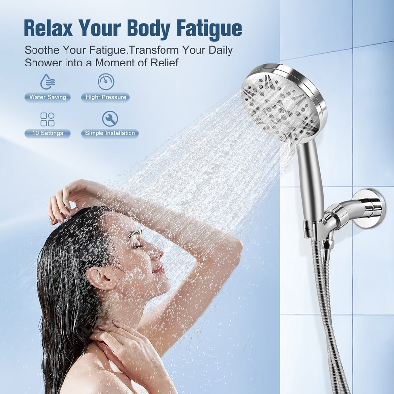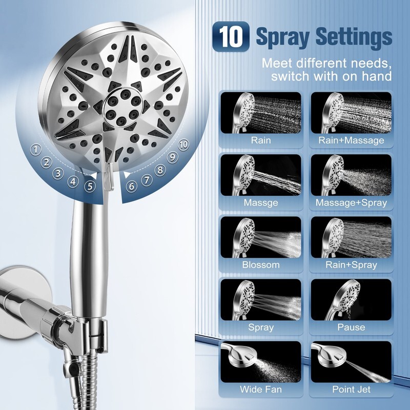 ?10 Spray Modes?Customize your perfect shower with 10 distinct spray settings?from gentle rain to invigorating massage. Uniquely featuring two powerful jet streams, our showerhead makes deep-cleaning bathtubs, tiles, and bathroom corners quick and effortless. Switch modes easily with a simple turn of the handle for a spa-like experience or heavy-duty cleaning in seconds. ?High-Pressure Design?Engineered with an upgraded pressure-boosting design, this showerhead maximizes water flow and ensures every nozzle delivers strong, consistent pressure. Whether you have low water pressure or simply enjoy a powerful rinse, our design provides full-body coverage and a thoroughly refreshing shower every time. ?5-Inch Wide Panel Comfort-Grip Handle?Enjoy expanded coverage with a generous 5-inch shower panel, paired with an ergonomic, anti-slip handle. The lightweight yet durable design offers ideal balance and control, making it comfortable to hold during extended use?perfect for washing hair, bathing kids, or tackling cleaning tasks around the bathroom. ?Durable Low-Maintenance Design?Made from high-quality, rust-resistant ABS chrome, this showerhead is built to last. The anti-clog silicone nozzles prevent mineral buildup, maintaining strong water pressure over time. A simple wipe keeps it looking new, and the materials are heat-resistant, lead-free, and safe for everyday use. ?Quick Tool-Free Installation?Install in minutes?no plumber needed. With a standard hose connection and clear instructions, our showerhead fits any standard shower arm. Everything you need is included, so you can upgrade your shower easily and start enjoying a more versatile and powerful bathing experience right away.