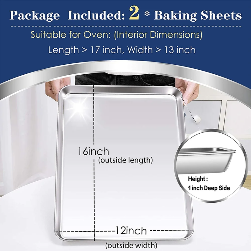 HEALTHY - VeSteel baking pan is made of premium18/0 stainless steel without any chemical materials, Help you get rid of toxic aluminum pans CRAFTED - Our stainless steel baking sheet has superior mirror finish to reduce the risk of food sticking, Smooth roll edges make it comfortable to hold and transfer EASY CLEAN - Deep full sides all around prevent food juice from flowing everywhere to keep your oven neat, Cleaning is a breeze and dishwasher safe DURABLE - Our baking tray is solid constructed with proper weight, Feel sturdy when holding in hands, Rust free and durable for a long service time MULITI USE - Set of 2, Both outer measured 16 x 12 x 1 inch, Inner measured 15 x 11 inch, Meet most of your daily baking or roasting needs, Also good to be used as serving tray, cookie sheet and etc.