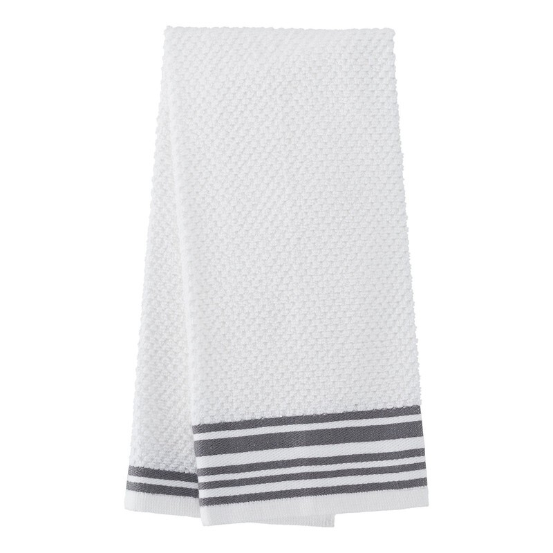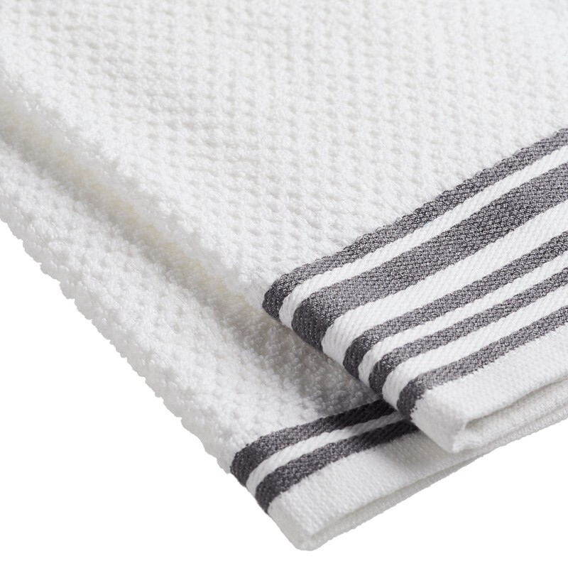 Absorbent kitchen towels dry up spills and wet dishes For cleaning up kitchen messes Hang from an oven handlebar, cabinet knobs, or mini towel hook between uses Includes two striped towels and two solid towels Striped towel made with 95% cotton and 5% polyester Solid towel made with 100% cotton Machine wash cold. Tumble dry low. Do not bleach
