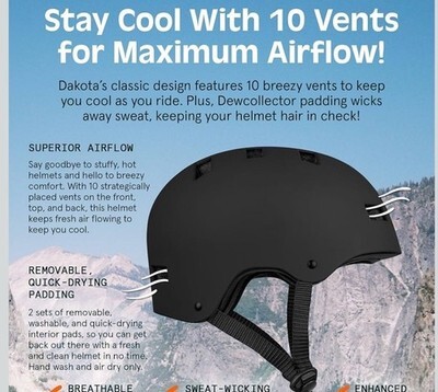 The Retrospec Dakota Adult Bike Skate Helmet in Medium size, Matte Black color, is a ventilated helmet designed for cycling and skating enthusiasts. Made of durable plastic, this helmet is manufactured in the United States and comes with a manufacturer's warranty. With its sleek design and innovative ventilation system, the Retrospec Dakota helmet provides both style and safety for riders who prioritize comfort and protection during their adventures.