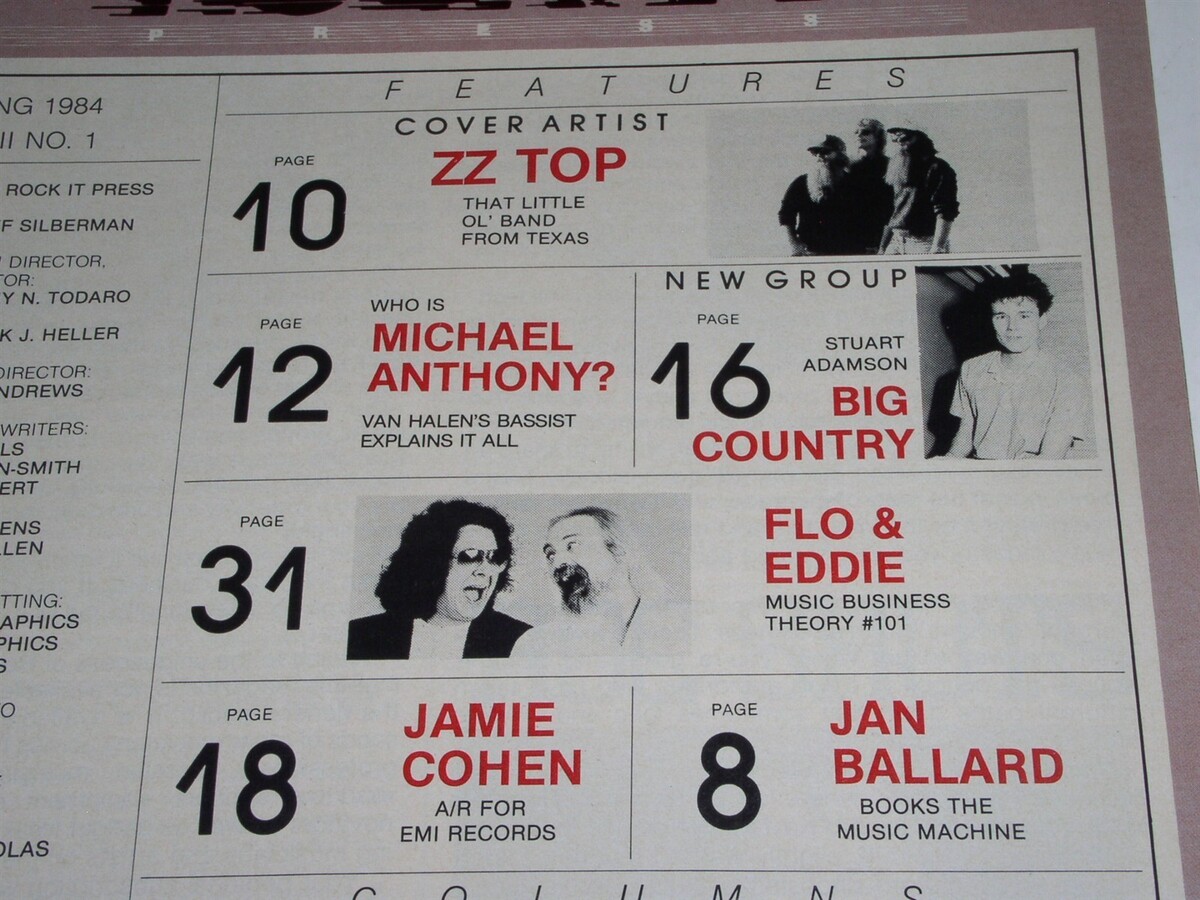 This is the Spring 1984 issue of "Rock It Press" magazine. Cover story on ZZ Top. Inside: Michael Anthony of Van Halen, Big Country Stuart Adamson, Flo Eddie, Jamie Cohen. A terrific item for the fan or collector.
