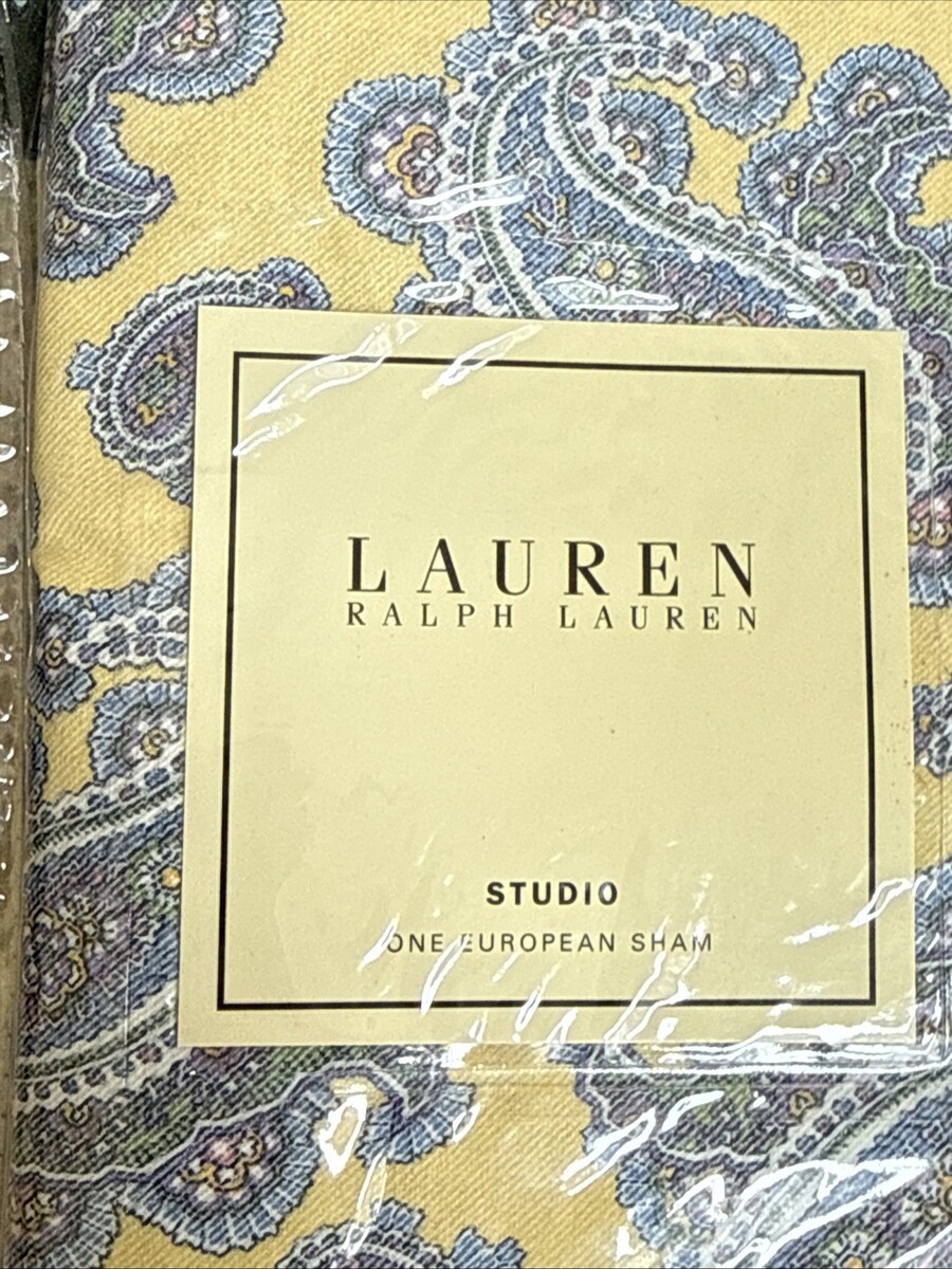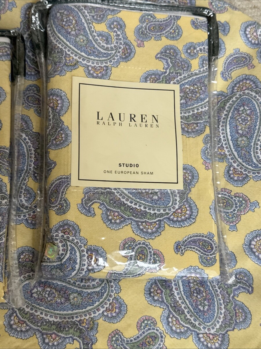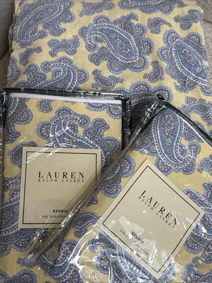 The product is a Ralph Lauren Studio Paisley Pale Yellow King Duvet Comforter Cover set, which includes 2 Euro shams. This three-piece set features a paisley pattern in yellow and blue colors, perfect for adding a touch of elegance to any bedroom. The duvet cover set is designed with a button closure and is made to fit a king-sized bed, providing a stylish and comfortable addition to your bedroom decor.