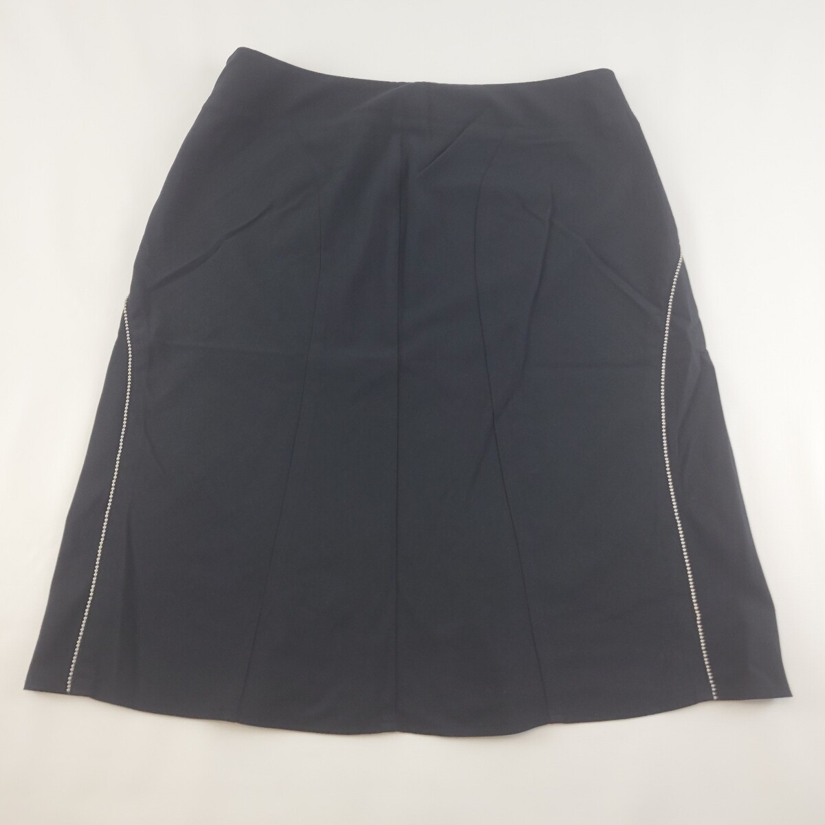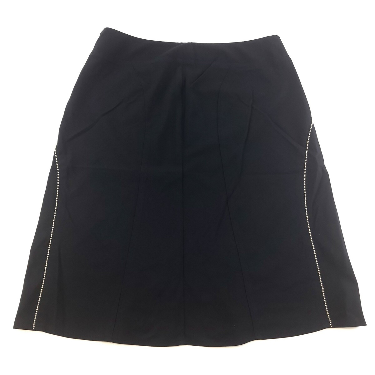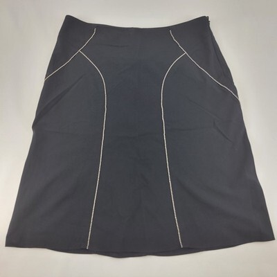 Chic and timeless black A-line skirt by The Limited Stretch collection. Features a flattering silhouette with silver ball-bead trim accenting the curved seams. Midweight stretch fabric offers a comfortable fit with a hint of structure. Fully lined with a hidden side zip closure. Great for work, office, business casual, or special occasions.