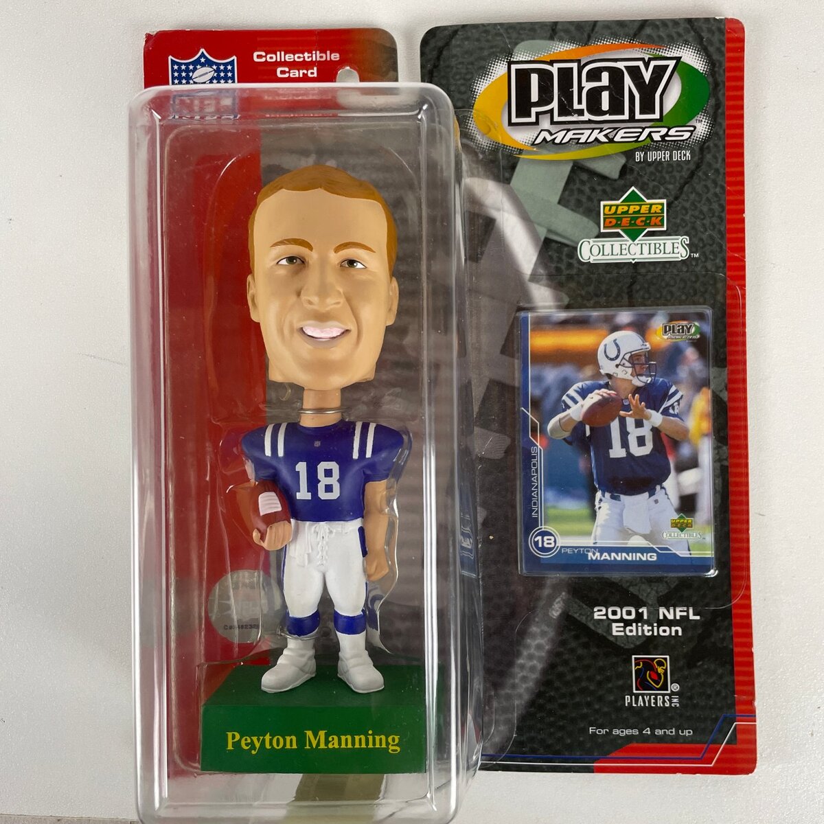 This collectible features the legendary Peyton Manning from the 2001 NFL Edition Play Makers series by Upper Deck. A must-have for any Indianapolis Colts fan, this bobblehead captures Manning in his iconic uniform, ready for display in a fan cave, office, or on a collector's shelf.