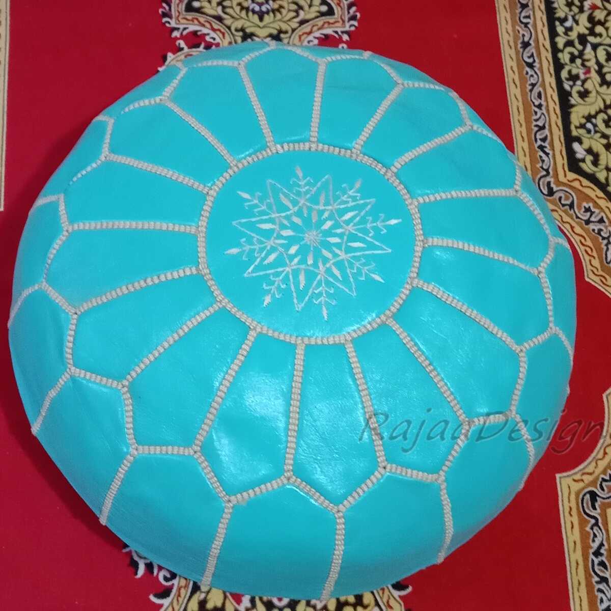 Blue Sky Moroccan Leather Pouf Ottoman: Hand-stitched Footstool