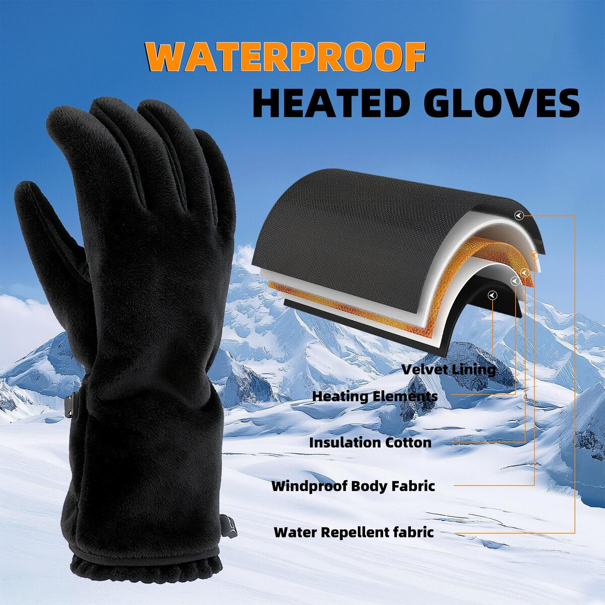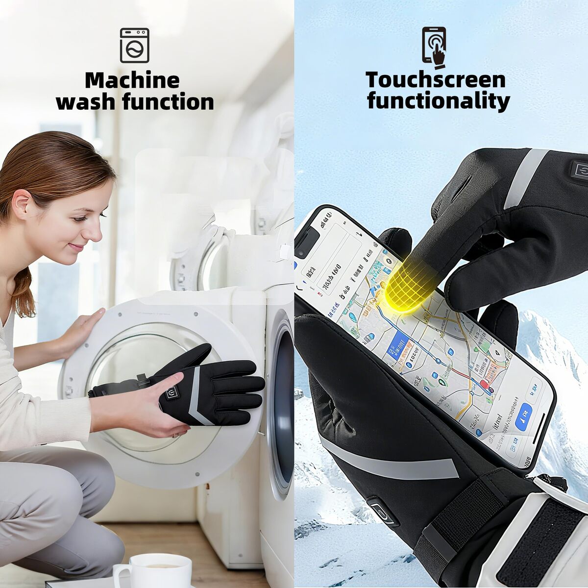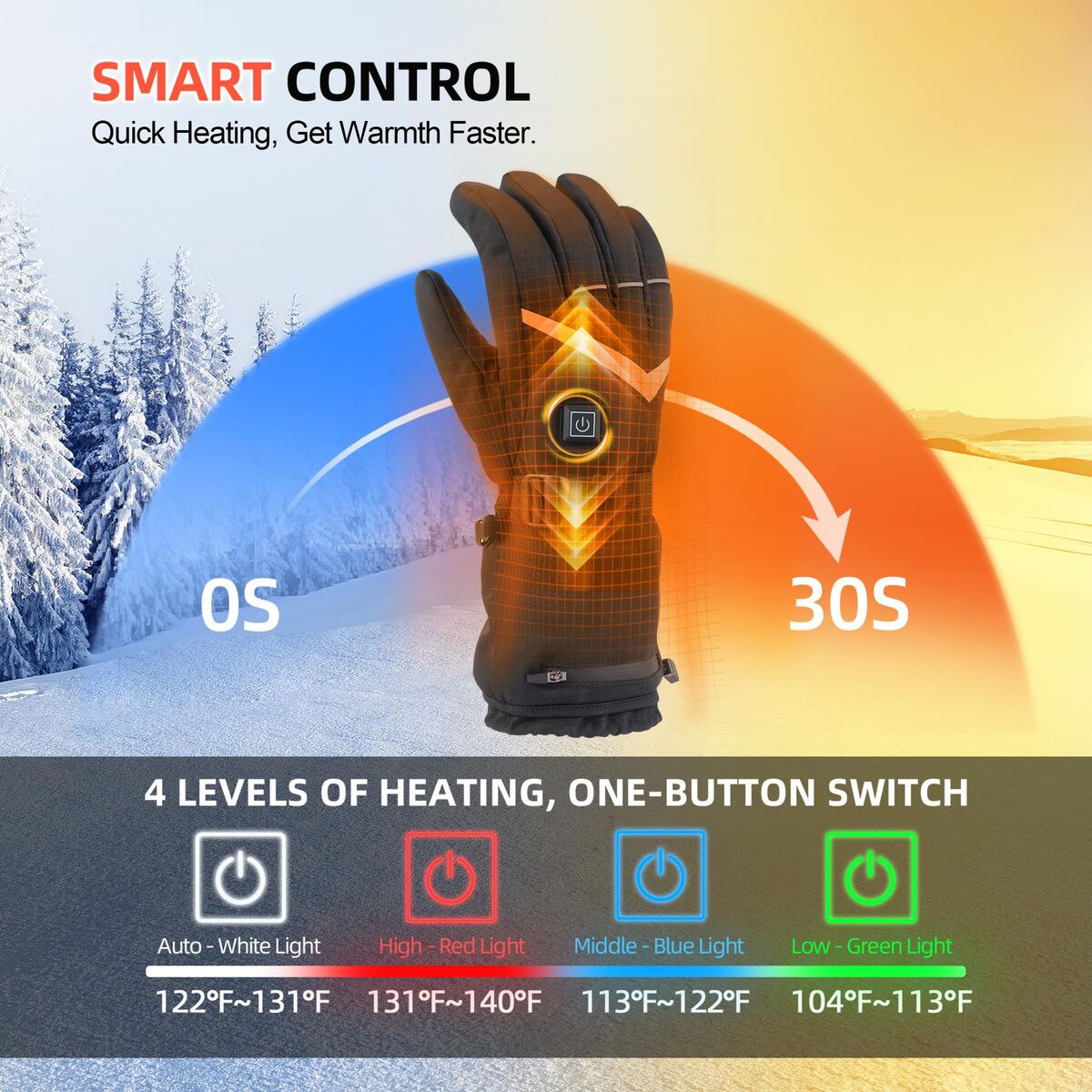 4-Level Temperature Control Upgraded Heating Elements: Featuring 4 adjustable settings (High-Medium-Low-Auto), the heated gloves warm up in just 18 seconds to 113F?131F. Equipped with advanced heating elements, they deliver even warmth across the back of the hand, fingers, and palm. Enjoy long-lasting warm for 3?8 hours, perfect for hiking, climbing, camping, fishing, and other cold-weather adventures.,Premium Windproof Material: The heated gloves outer shell is made of durable polyester with a snug elastic wrist cuff to block rain and snow. The middle layer integrates heating elements and insulated padding, while the soft, breathable fleece lining ensures warmth and comfort.,Touchscreen Design Anti-Slip Grip: Heated gloves conductive fibers on the thumb and index finger allow seamless phone calls, scrolling, and device use without removing the gloves. The palm features anti-slip silicone strips for a secure grip, ideal for skiing, snowboarding, driving, cycling, and cold-weather work.,Long-Lasting Battery Easy Charging: Electric gloves includes two 7.4V 5000mAh rechargeable batteries, providing 3?8 hours of continuous warmth. The included USB cable ensures convenient charging, keeping you powered during outdoor activities.,Unisex Design Perfect Gift Choice: The heated gloves for women and men available in three sizes with a sleek black design, these gloves suit any winter outfit. A thoughtful and practical gift for loved ones in freezing weather! If you have any questions during use, please feel free to contact us.
