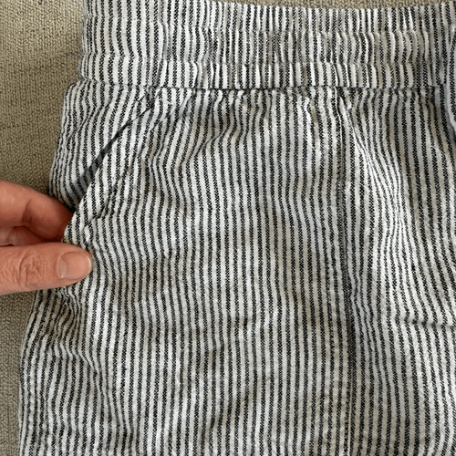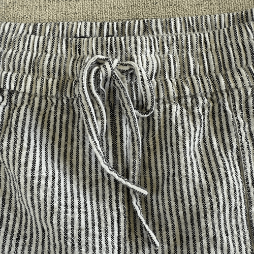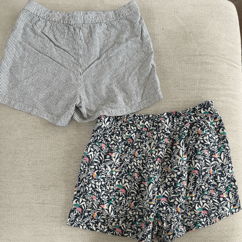 Two pair of size medium linen blend pull on shorts. The first pair is J.Crew blue and white stripe with hip pockets and elastic and drawstring waist. These shorts have a 4 inch inseam and measure 15 inches straight across the waist. 10 inch rise They are linen and viscose blend. The second pair are loft, blue and white foliage print with colorful green, pink, blue and yellow birds. They have a 3.75 inch inseam and a wide band elastic waist with a paper bag ruffle at the top. 15.5 inches straight across the waist with a 12 inch rise. Hip pockets. Rayon and linen blend. Neither pair of shorts have back pockets. I am not interested in separating at this time. ?