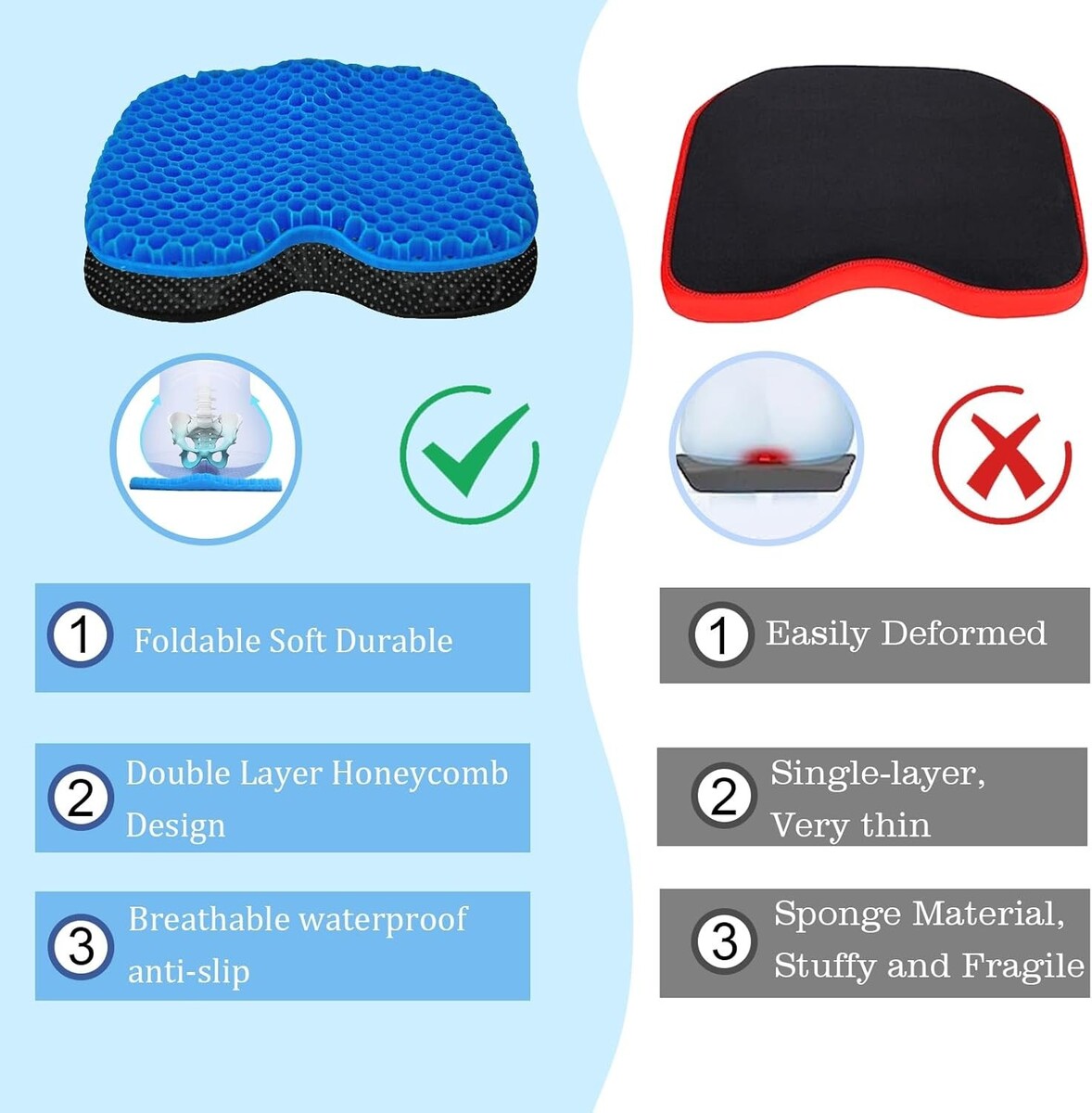 Breathability Enjoy the Coolness: Therapeutic thick honeycomb gel design increases airflow, providing ultimate cooling comfort to prevent seat sweat. The double-sided structure enhances breathability under pressure.