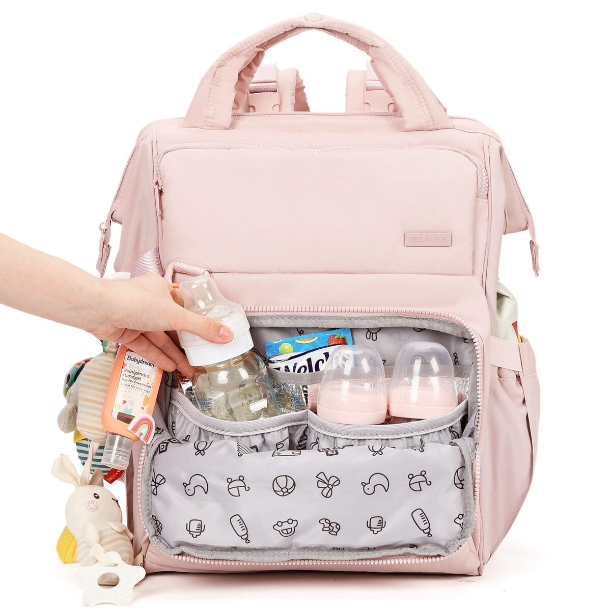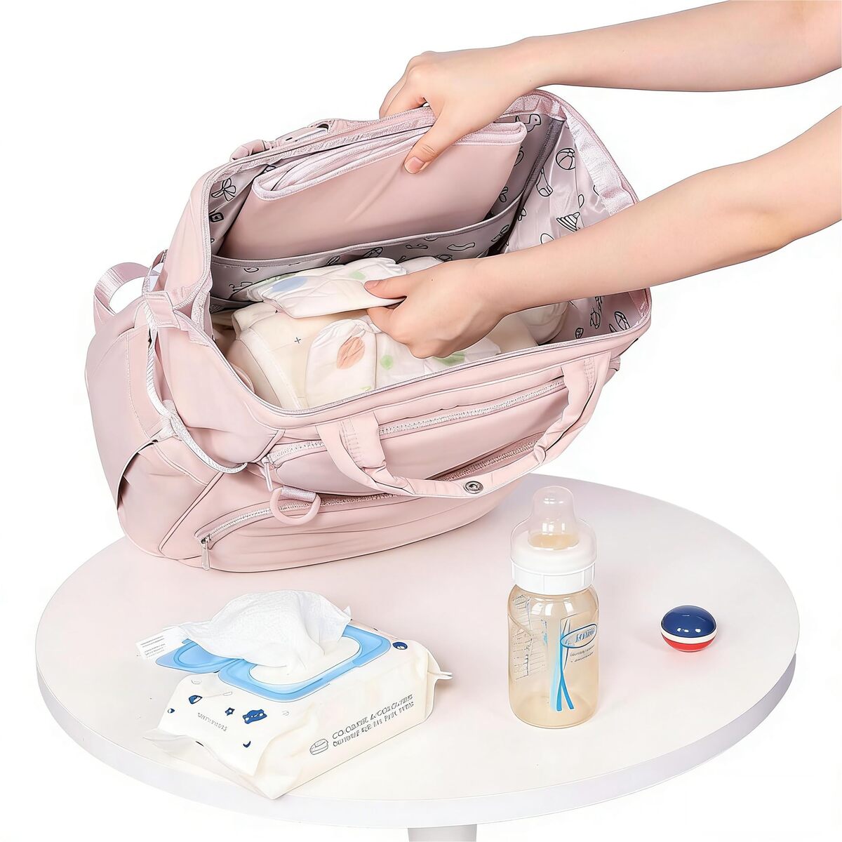 Incredibly Roomy: 12.27.916.5 inches (LWH), with a total capacity of 26L. It effortlessly holds all your baby's essentials for a full day out?diapers, clothes, wipes, bottles, snacks, and toys?while still having space for mom's personal belongings. Everything you and your baby need, organized in one bag,Wide-Mouth Opening for Easy Access: The large, wide-mouth opening makes every item instantly visible and within reach. No more frantic digging through baby supplies. This thoughtful design brings effortless organization to motherhood, keeping everything in its place even during the most demanding moments with your baby,Multi-Functional Storage Compartments: Stay perfectly organized with 12 dedicated compartment pockets?no redundant space, each thoughtfully designed for a specific purpose. Includes 4 insulated bottle pockets lined with foil to keep milk, water, or juice at the ideal temperature. A dedicated wipe-clean insulator section safely stores soiled clothes, while a special external mommy pocket provides quick access to your phone, wallet, and other personal items,Extra-Large Easy-to-Clean Changing Pad: An extra-large changing pad (3214.5 inches) creates a dedicated, portable changing station for your baby. Change diapers safely, cleanly, and comfortably anywhere. The pad is made from wipe-clean PEVA material, making it easy to maintain hygiene and protect your baby from surface germs,Convenient On-the-Go Details: Clever details enhance everyday convenience. Equipped with a stroller strap that features a one-handed release buckle for hassle-free use, it also has an external D-ring for hanging hand sanitizer and side loops to securely hold your baby's favorite toy. These features keep comfort and essentials accessible, helping to soothe your little one during outings