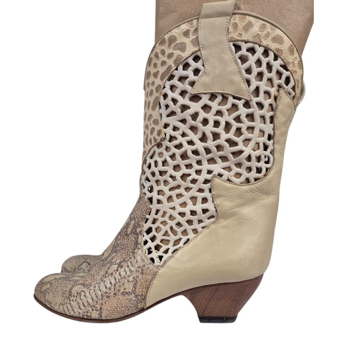 RARE VTG Kenneth Cole Leather Open Work Ivory and Real Snakeskin ( rattlesnake?) Vamp Wood Heel Boot 8.5 Wood cone heel, coastal cowgirl. Unique and I think, 80s or 90s, in excellent used and wearable condition. Leather soles, leather latticework, leather lining. They need just a little cleaning up. Made in Italy- these aren't off any off-the-rack boots!