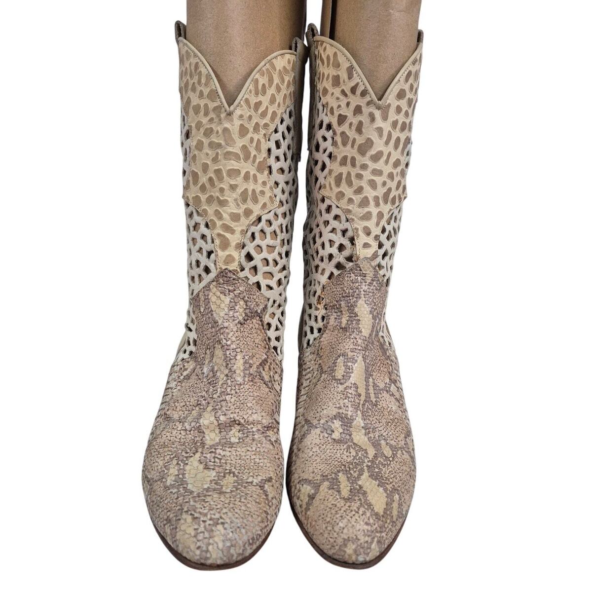 RARE VTG Kenneth Cole Leather Open Work Ivory Snakeskin Vamp Wood Heel Boot 8.5