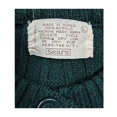 This sweater was produced for Sears in the 1970s, when the brand was a leader in affordable, stylish basics for the American wardrobe. The Made in Korea label reflects a key moment in garment production history ? Korea was known in the 70s and 80s for its high-quality knitwear manufacturing before global outsourcing shifted. With its ribbed texture and rich color, this sweater captures the practical yet fashionable spirit of the era.
