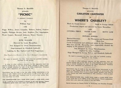 There are 2 different Sea Cliff Summer Theatre programs in this lot. Sea Cliff Dinner Theatre Programs from Summer Season 1955 production of Picnic with June Walker Summer Season 1956 production of Where's Charley with Carleton Carpenter.