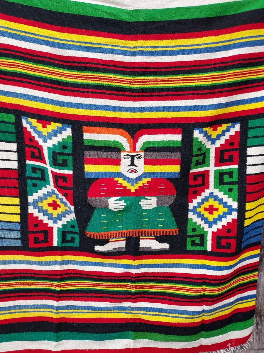Vintage Mexican Mexico Woven Wool Serape Aztec God Goddess Blanket 54x72. Condition is Used. Shipped with USPS Ground Advantage.
