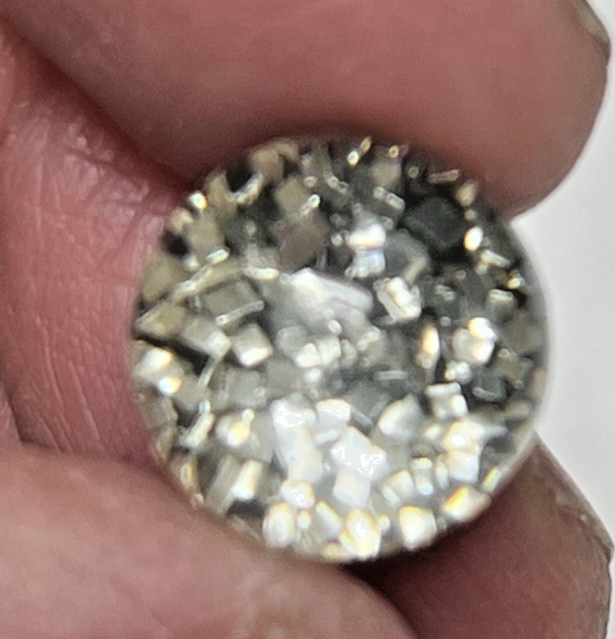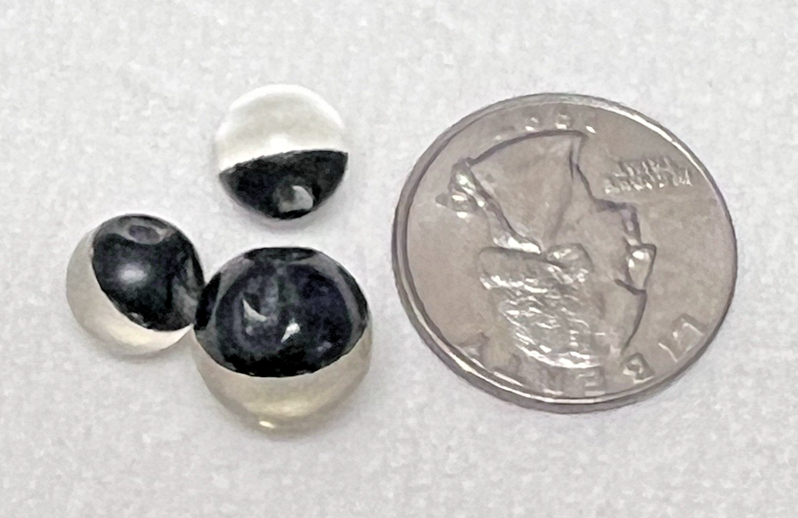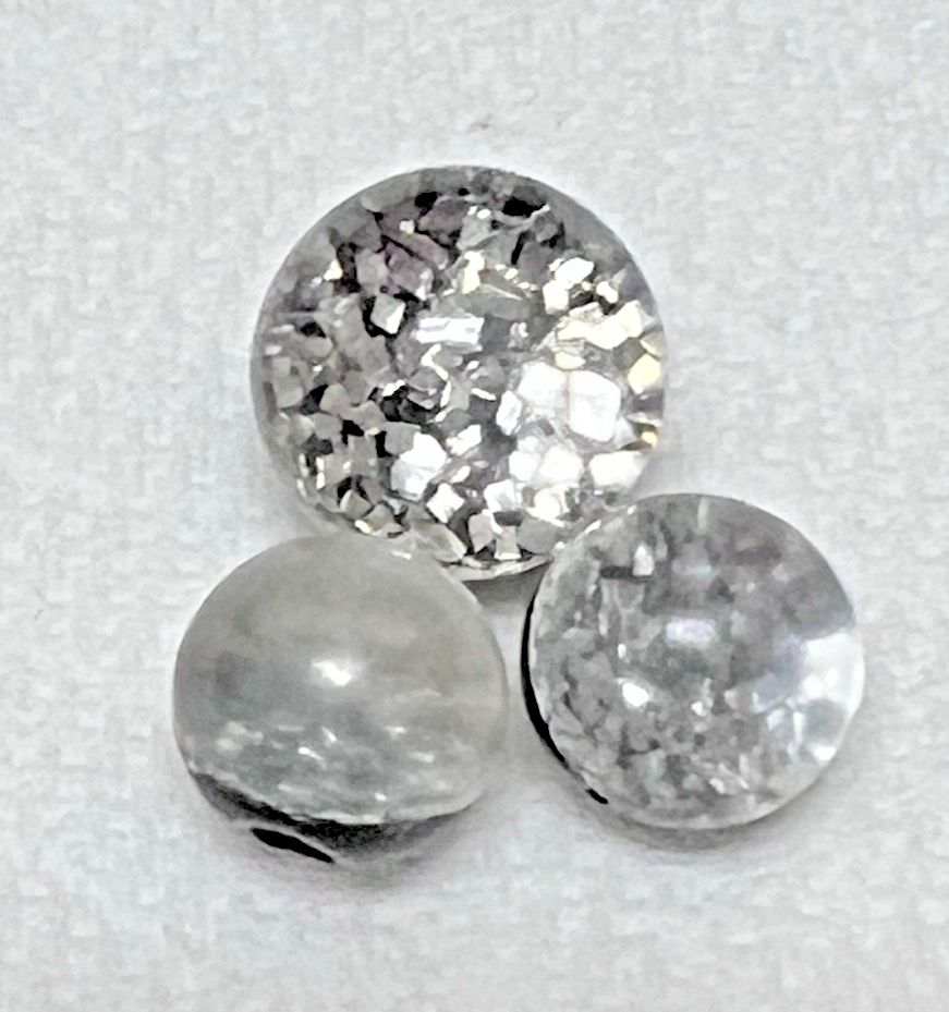 3 Antique Round Glass Paperweight Buttons w Silver Glitter 3/8 and 1/2 inch In very nice shape 1 of the smaller ones is cloudier than the other 2