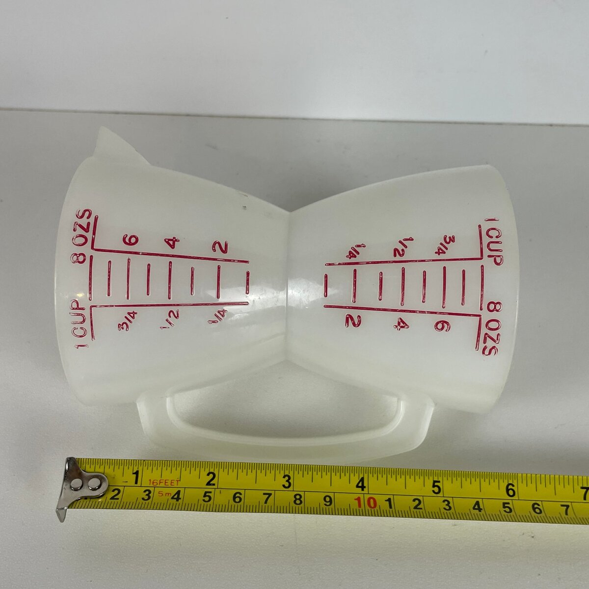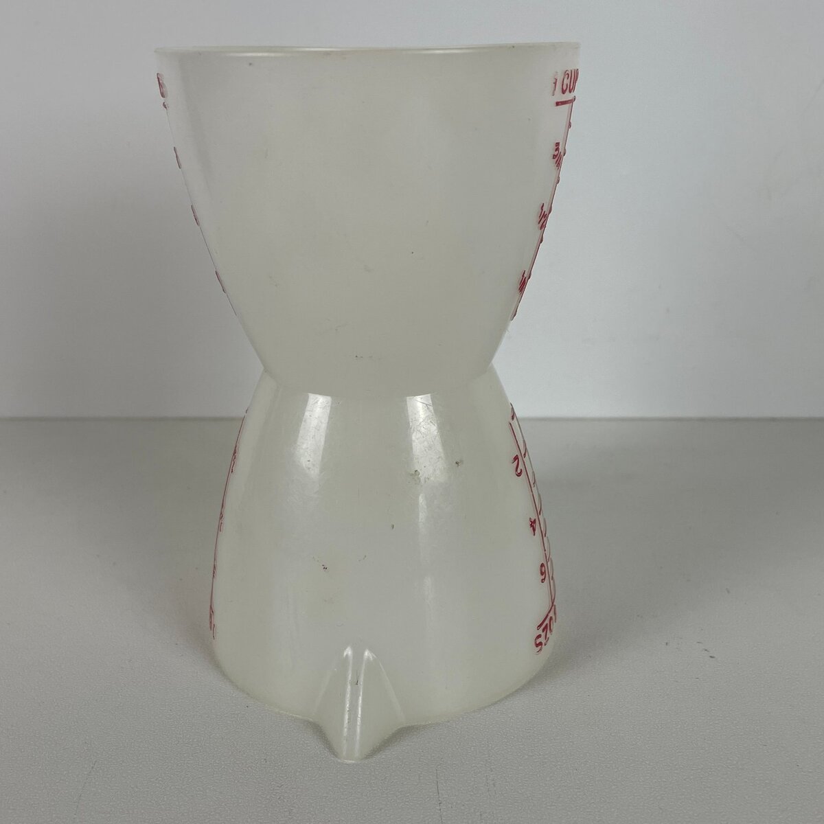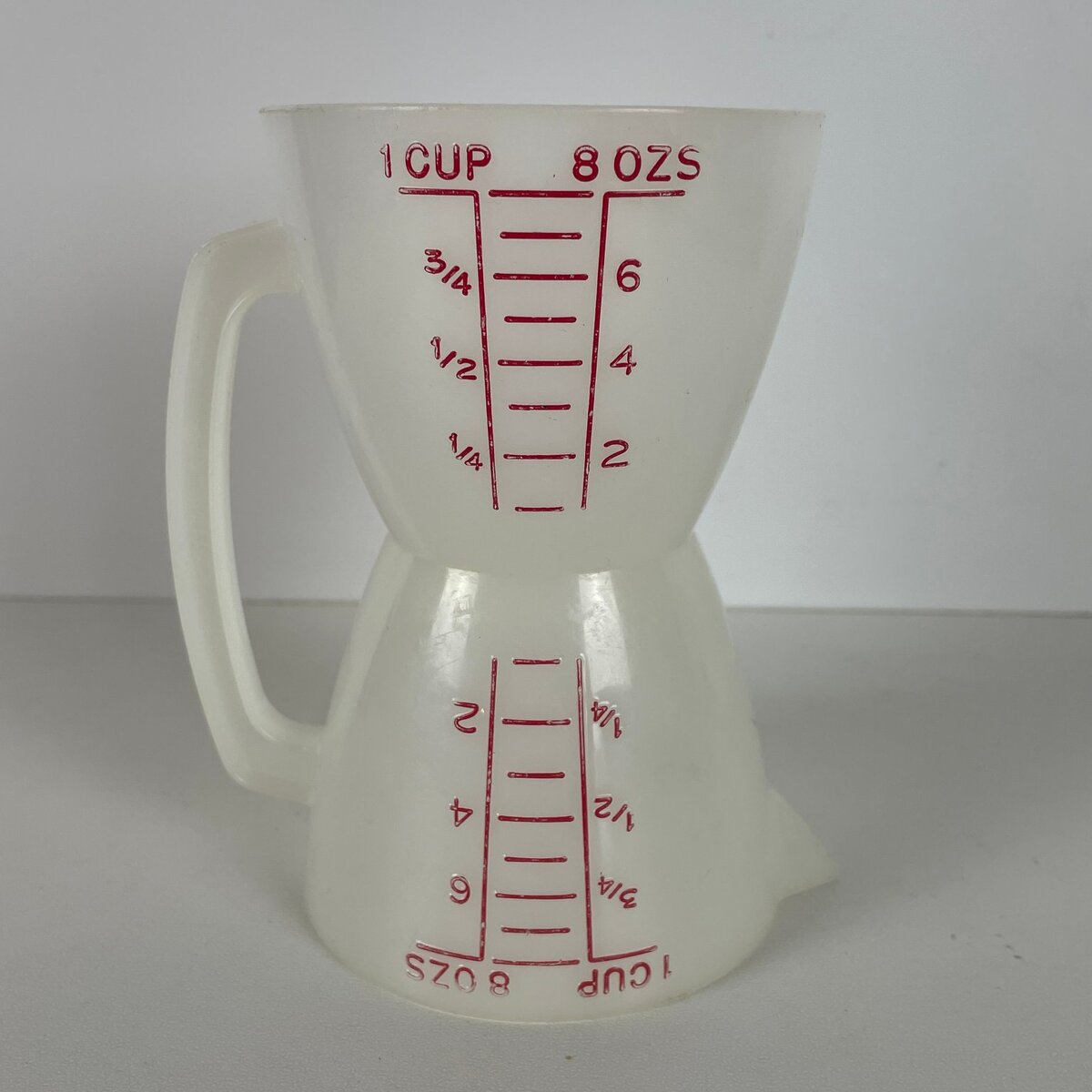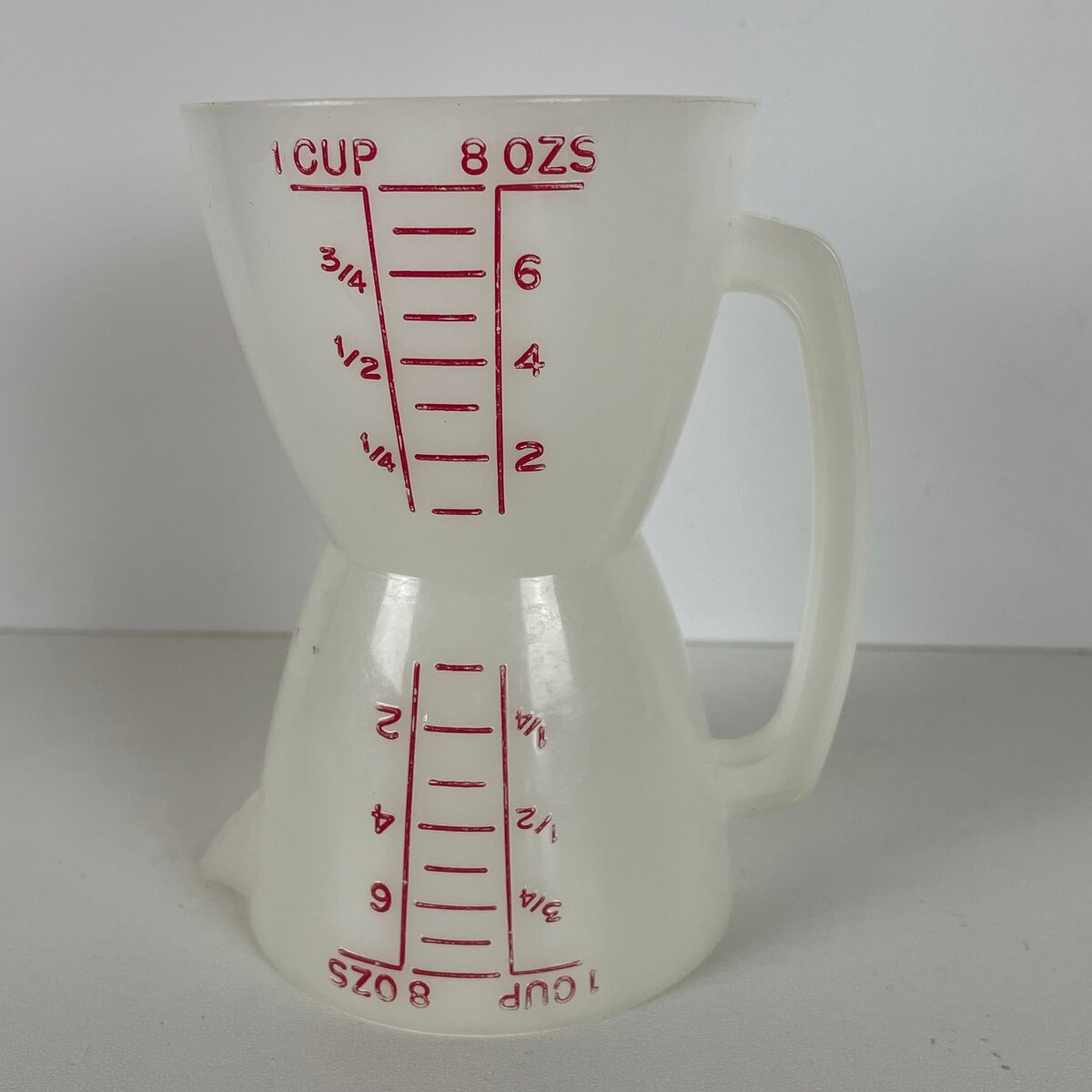 This is an unbranded vintage hourglass measuring cup, a unique and functional tool for any kitchen. Crafted from durable translucent white plastic, this measuring cup features a distinctive dual-sided design, allowing for quick and efficient measurement from either end. Each side is clearly marked with graduated measurements in both cups (up to 1 cup) and ounces (up to 8 oz), making it versatile for various cooking and baking needs. The bold red markings ensure easy readability against the white plastic.