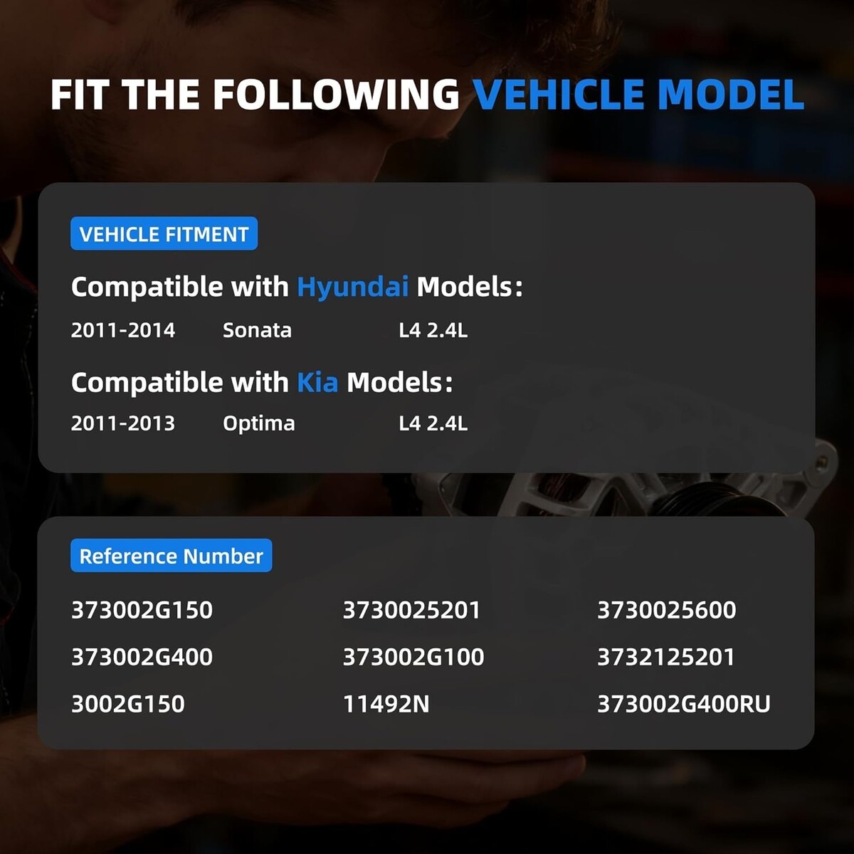 373002G150 Alternator 2.4L Compatible with 2010-2013 Hyundai Sonata Kia Optima Alternator Replacement for 3730025201,3730025600,373002G400,373002G100, TG11C087 6-Groove Clutch Pulley