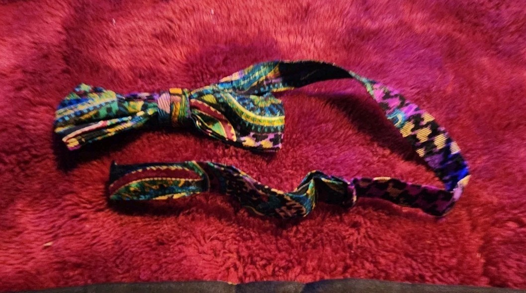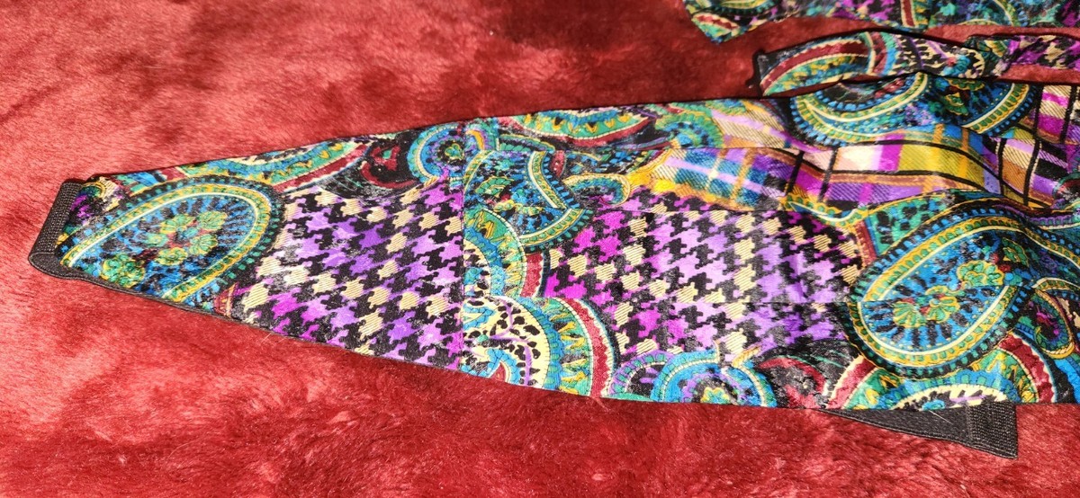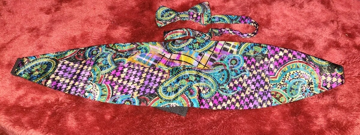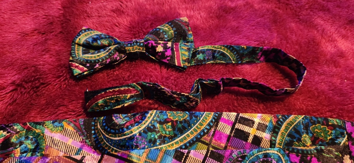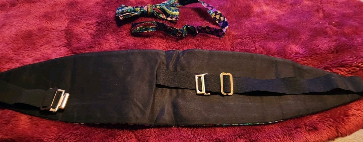 Good condition Mel Howard one size Cummerbund and bow tie combo. Funky print.