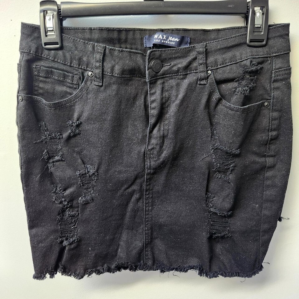 Wax Jeans Mini Skirt L Black Frayed 90's Grunge Festival Denim Edgy Rock Style