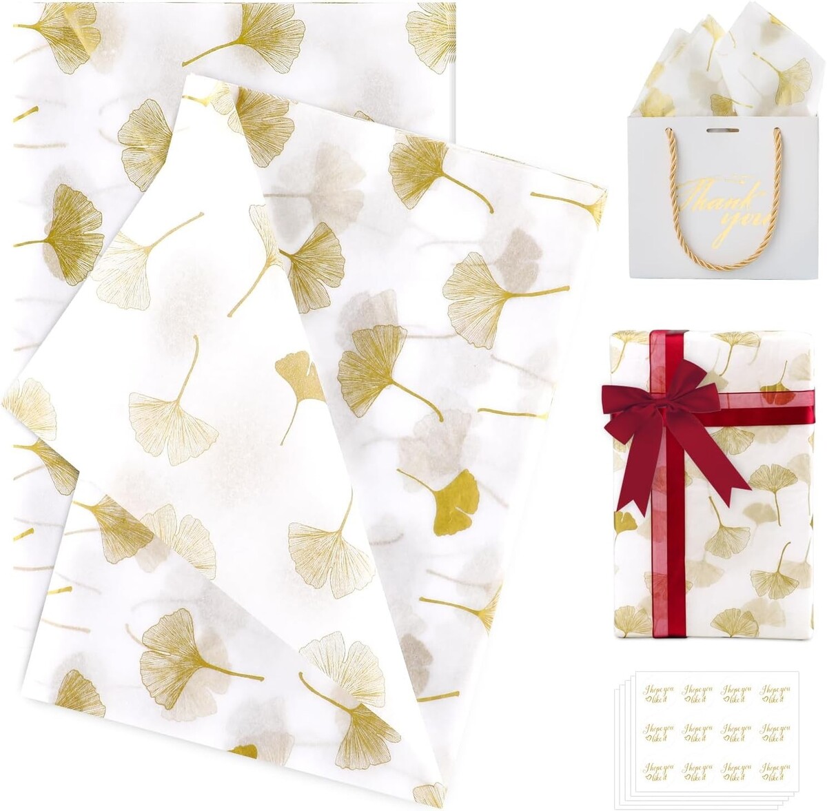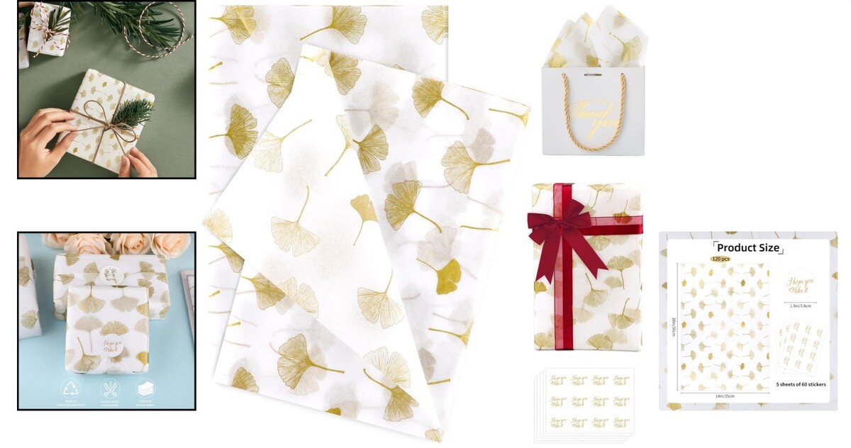 Elegant 120-Sheet Gold Ginkgo Leaf Tissue Paper with Stickers for Gifts Crafts