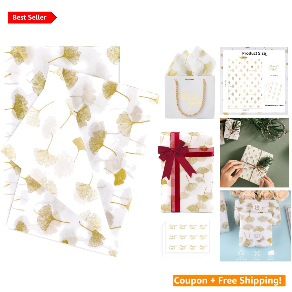 - Featuring a stunning gold ginkgo leaf pattern, this vintage tissue paper infuses a luxurious and timeless feel into your gift wrapping. Ideal for elegant occasions such as weddings, birthdays, baby showers, and delightful holiday celebrations.