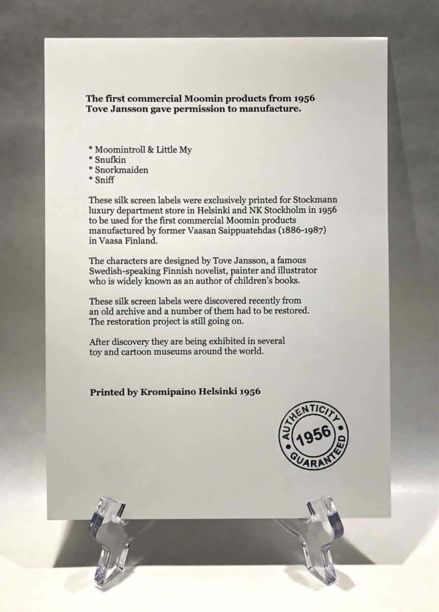 Authenticity was verified with the Moomin Museum prior to the exhibition and confirmed that these are the first ever commercial Moomin products. This series can be seen at Moomin Museum.