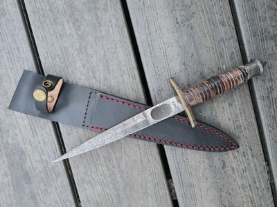 V-42 FSSF Stiletto Dagger Knife ? WWII Replica | Damascus Steel Blade + Leather Sheath