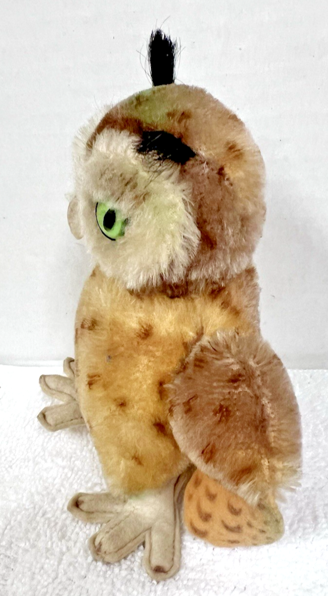 Vintage Mohair Owl w Felt Printed Wings Green Eyes 5 1/4 inches Tall