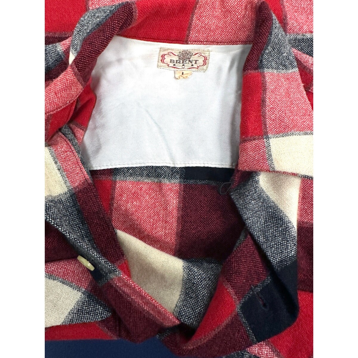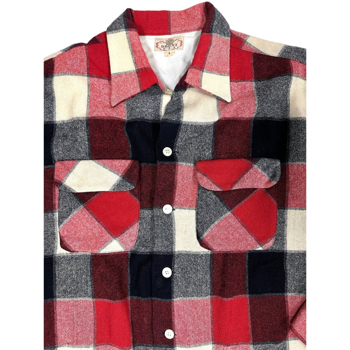 Vtg 1950s BRENT men?s plaid shirt, sold at Montgomery Ward. Features a loop collar, wool-rayon blend fabric, double stitching, two flap chest pockets, and quarter lining. A true mid-century leisurewear classic.