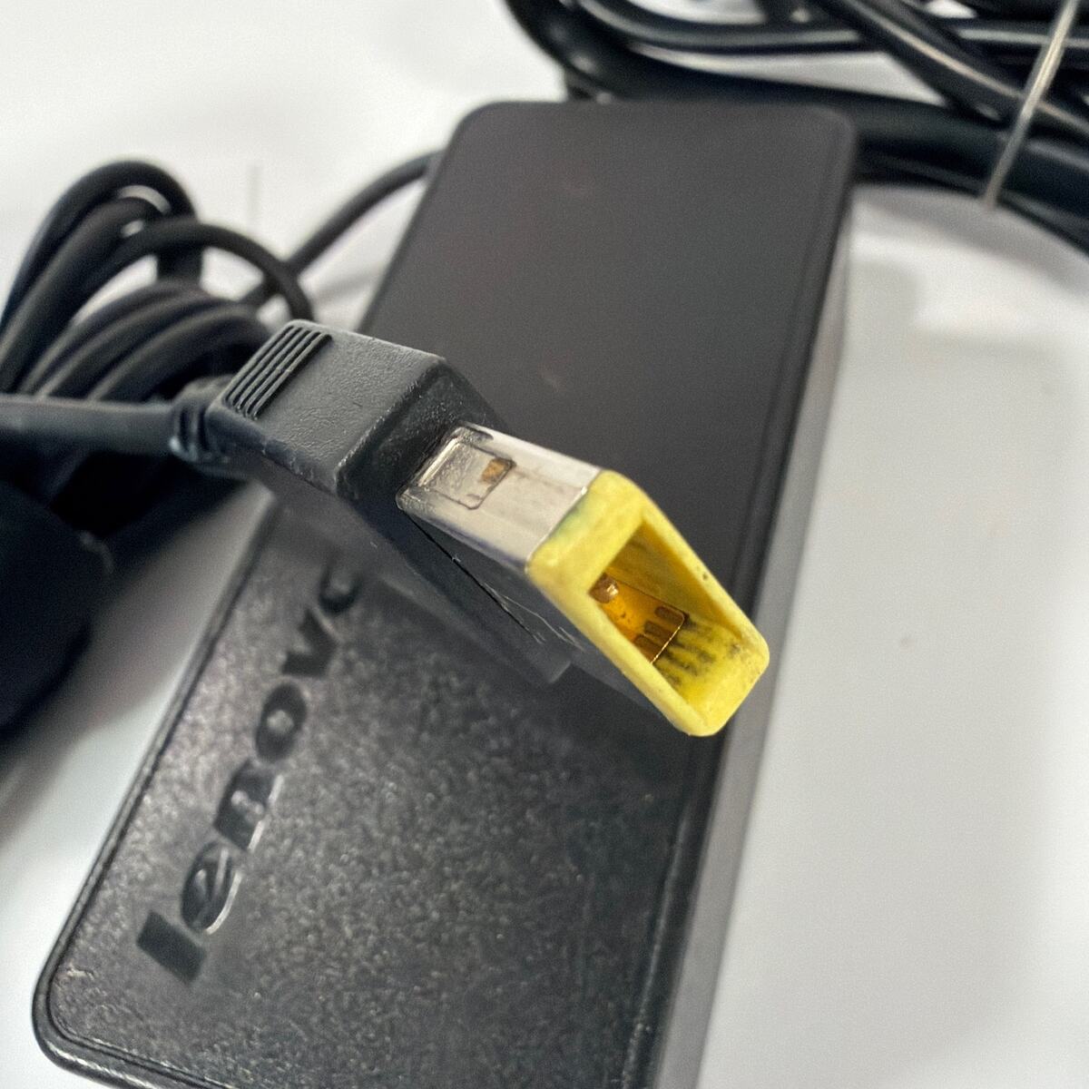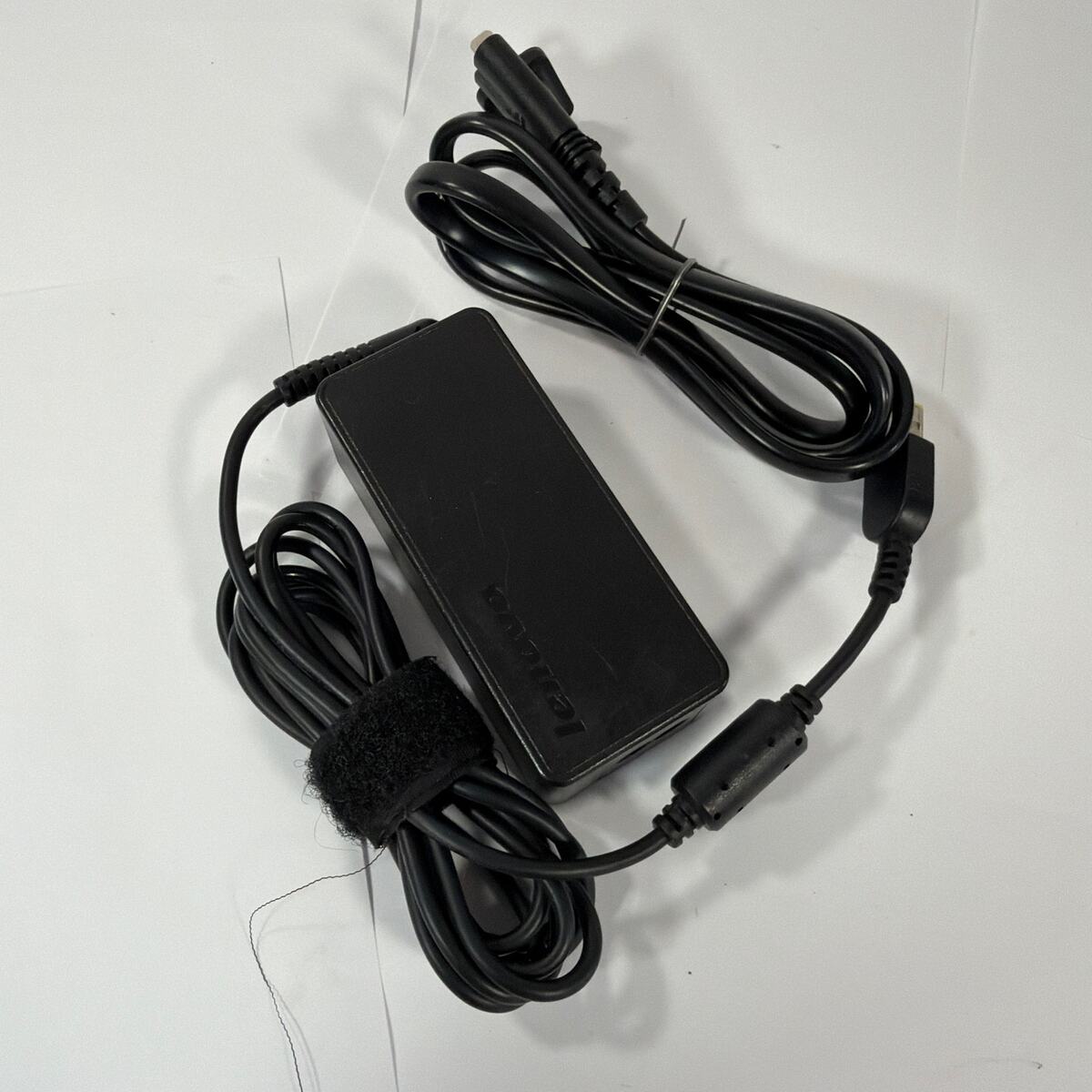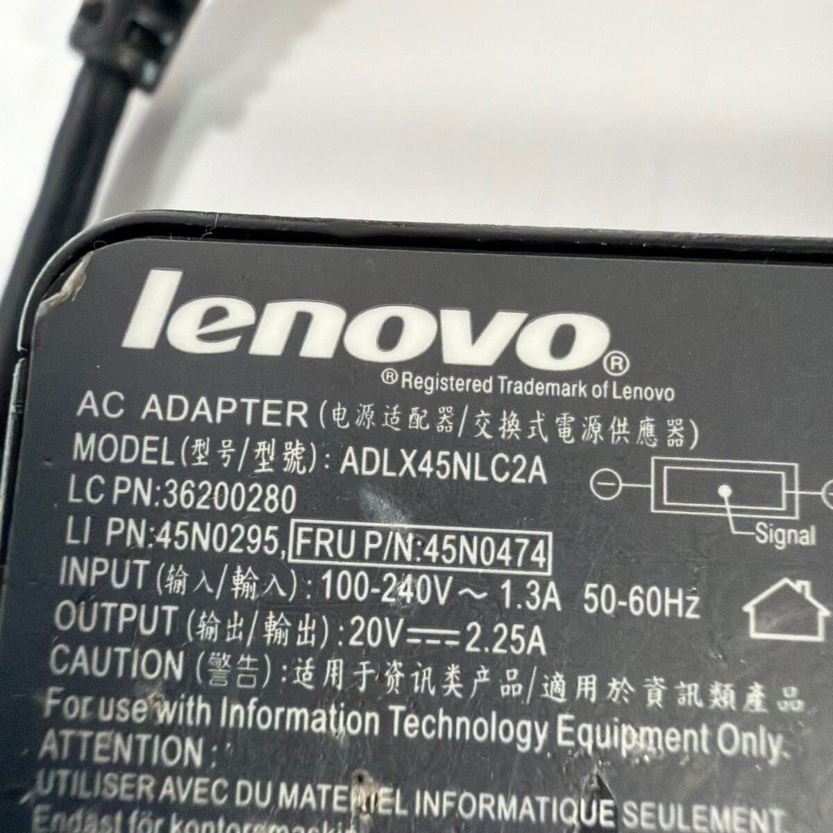 Lenovo AC adapter, model ADLX45NLC2A (20V 2.25A / 45W) with slim-tip connector. Tested working. Shows typical cosmetic wear from use, including scuffs on the casing/label and some discoloration on the tip. Includes the adapter and attached power cord shown.