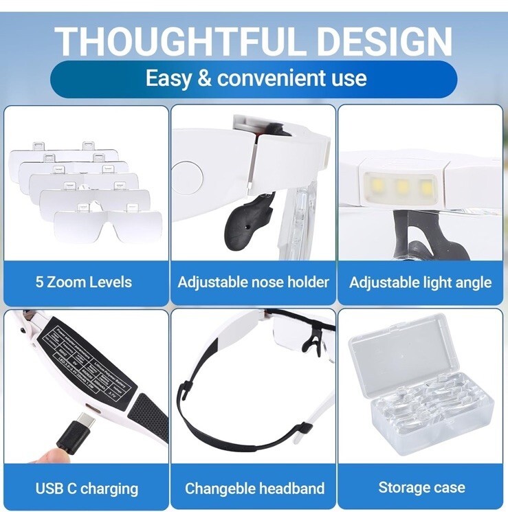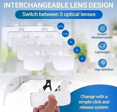 Head Magnifier Glasses with 3 LED Lights and 5 Detachable Lenses 0.75X, 1.25X