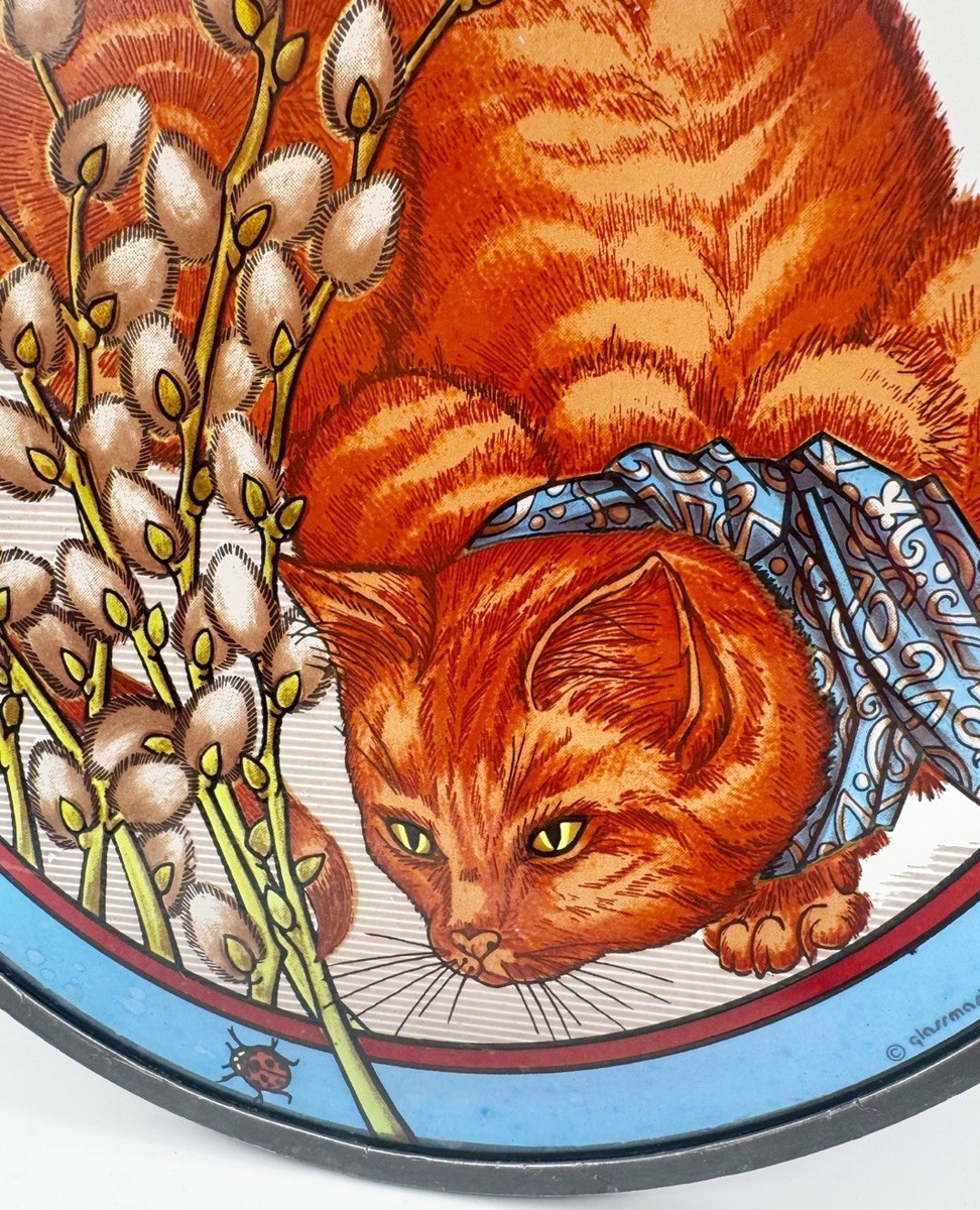 Features an orange tabby cat, pussywillows and a ladybug