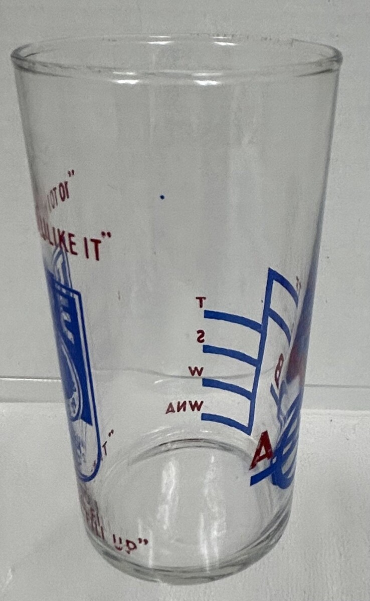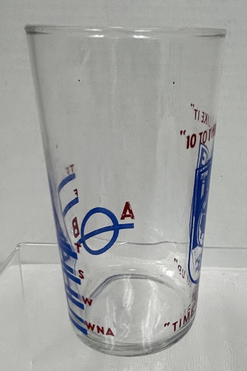 Vintage Time Petroleum Products Clock Logo Libbey Drinking Water Tumbler Glass. Very nice used condition Time Petroleum Products clock logo glass drinking tumbler...could be water soda milk, measures approx. 4 3/4" tall, no damage, blue red logo lettering clear. See pictures.
