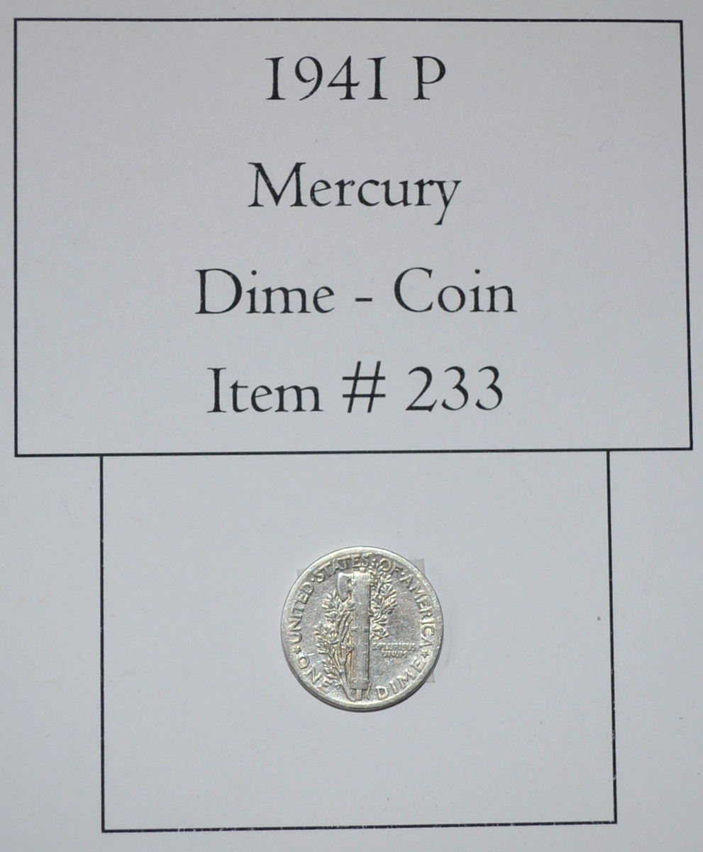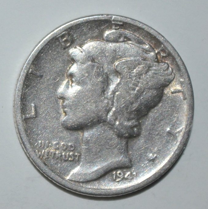 One 1941 P Mercury Dime coin, in Fine condition. It’s been in circulation. Features are crisp and clear. There are no nicks or scratches.