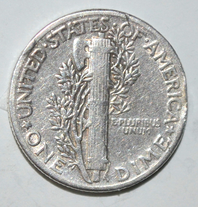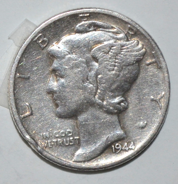 One 1944 P Mercury Dime coin, in Fine condition. It’s been in circulation. Features are crisp and clear. There are no nicks or scratches.