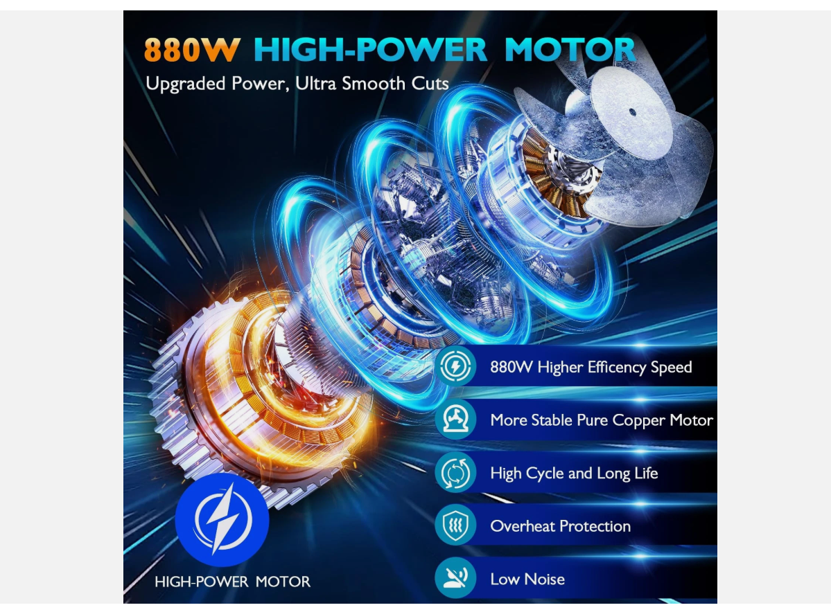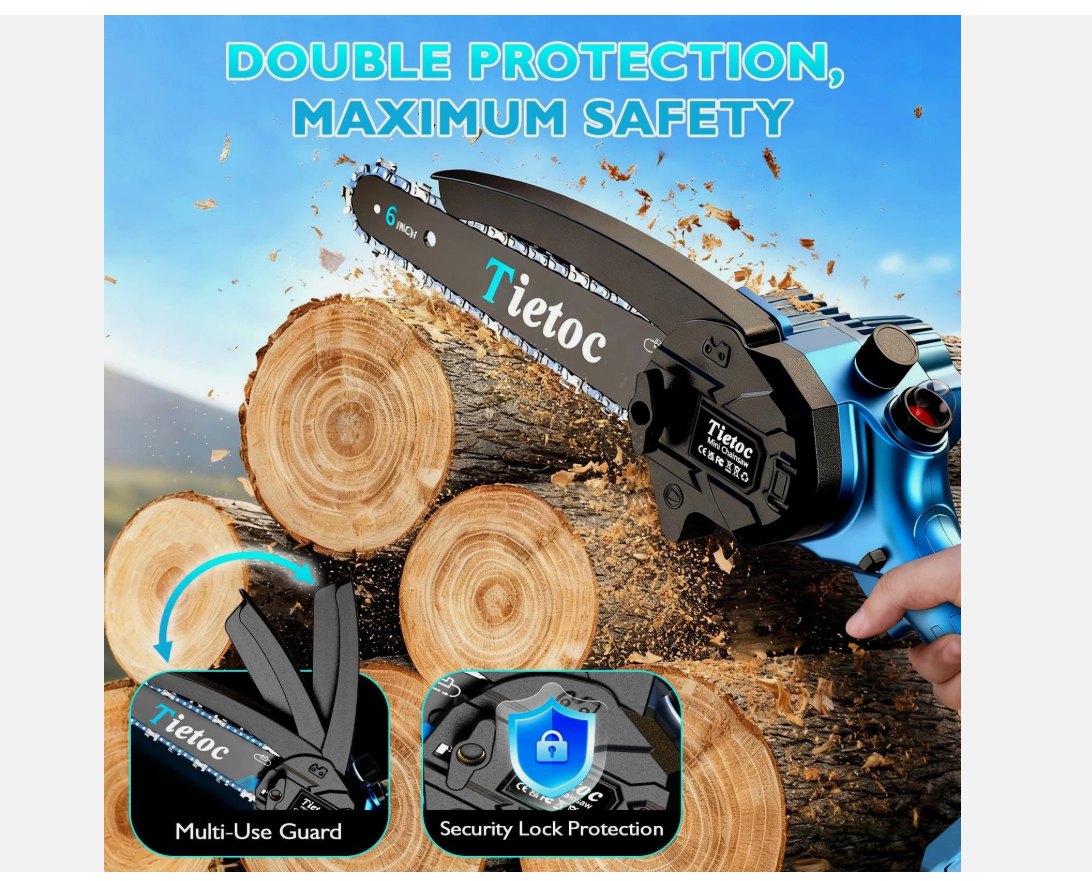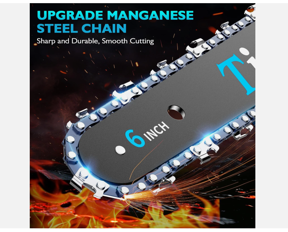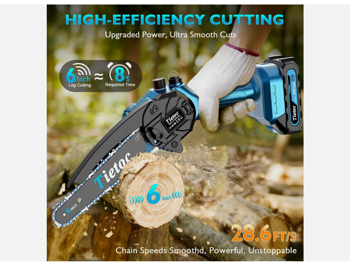 [Upgraded 880W High-Efficiency Pure Copper Super Motor] - Tietoc 6-inch cordless mini chainsaw boasts an upgraded 880W copper motor with 28.6 ft/s chain speed, cutting a 6-inch log in just 8 seconds. Fast, powerful, and efficient for both home and outdoor work.