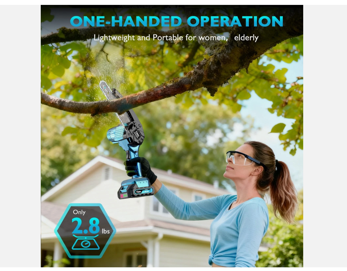 [5 Layers of Safety Protection] - 1. Security lock prevents accidental activation : The security lock start button need to be pressed simultaneously for the chainsaw to start; 2. Safety baffles : Prevent the wood chips from splashing; 3. Equip with anti-cut gloves: protect your hands; 4. Equip with an anti-slip texture handle: Making you grip the mini chainsaw tightly; 5. Equip with goggles: Protect your eyes from sawdust. Only for Your Safe Work!